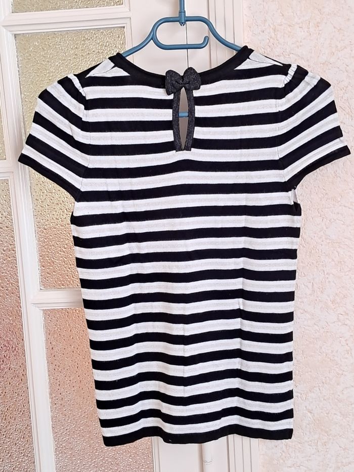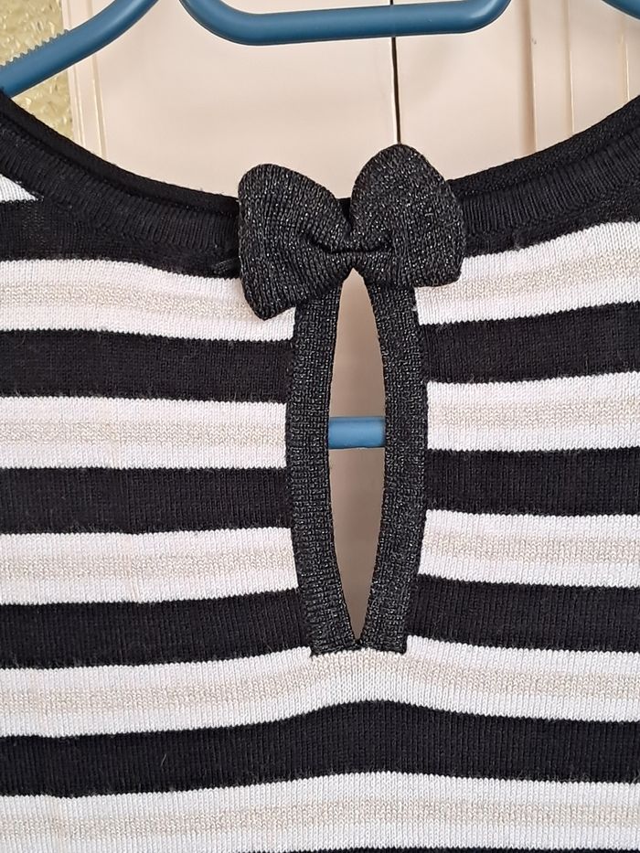 Pull léger à rayures bleu marine, arenté, blanc Petit nœud derrière avec des paillettes argentées