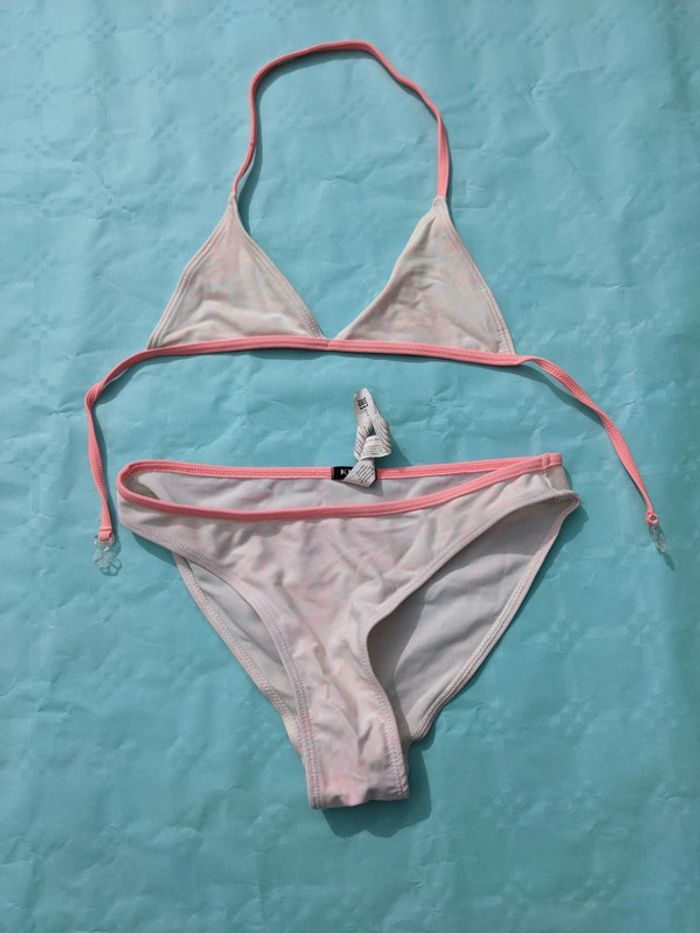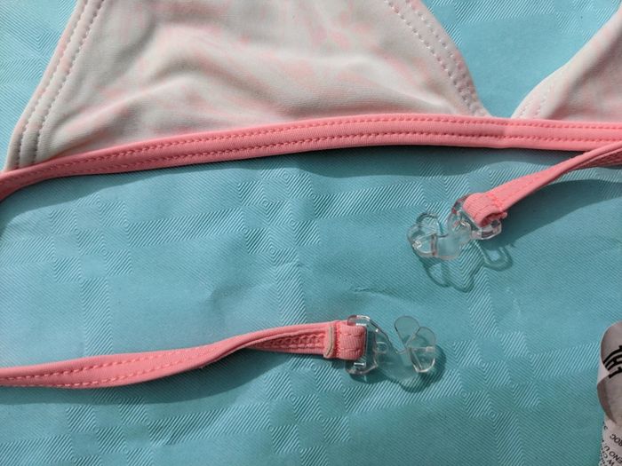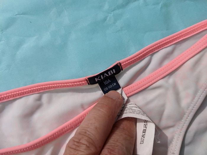Maillot de bain fille taille 10 ans marque Kiabi crème avec liseré rose et dessin de feuilles rose très clair. Le ruban élastique passe dans la nuque. Poids 45g Mes autres annonces du même âge #joeypotter91_filledixans [Sac Ikéa 2]