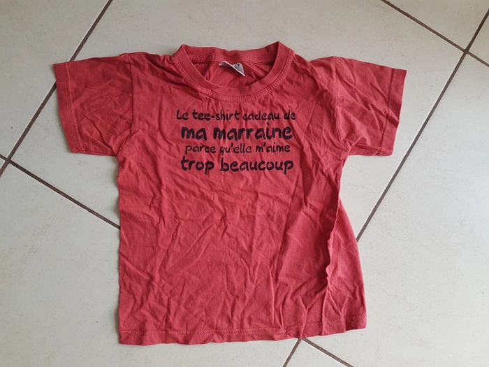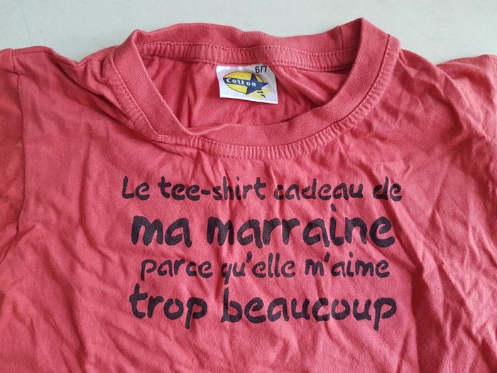 T-shirt fille 6-7 ans avec inscription le t-shirt cadeau de ma marraine parce qu'elle m'aime trop beaucoup Poids 75g Mes autres annonces du même âge #joeypotter91_filleseptans