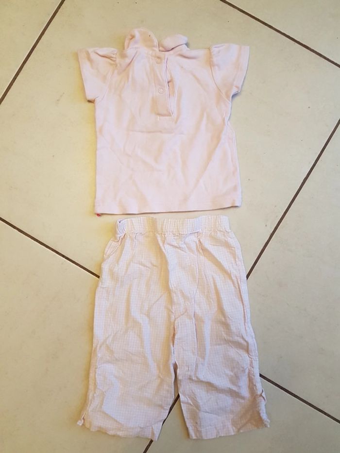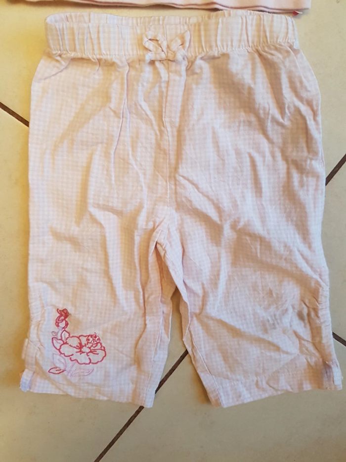 Tenue d'été fille taille 9 mois composée d'un pantalon taille élastique marque in extenso motif vichy blanc et rose clair à carreaux, petits liens décoratifs sur les côtés et fleurs coccinelle papillon en surpiqûres + t-shirt manches courtes col claudine assorti. Une toute petite trace sur le pantalon qui partira probablement au lavage mais comme je suis honnête je le précise :) Poids 105g Mes autres annonces du même âge #joeypotter91_filleneufmois