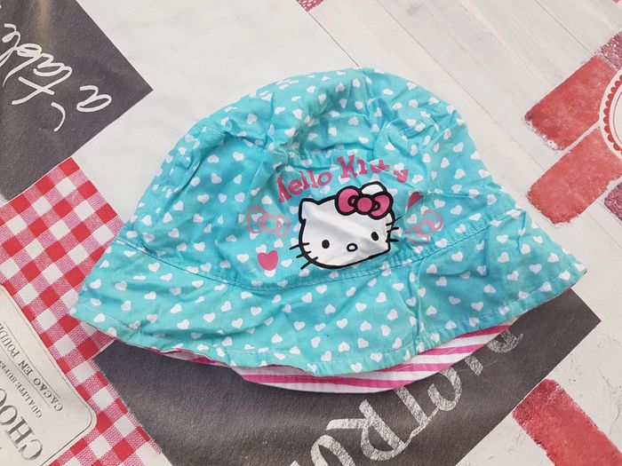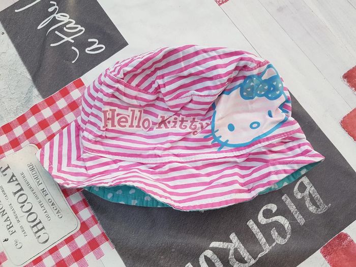Chapeau été fille Hello Kitty réversible. Tour de tête 52 cm. Pratique : 2 chapeaux en un pour assortir avec la tenue :) Poids 30g Mes autres annonces du même âge #joeypotter91_filledeuxans #joeypotter91_filletroisans #joeypotter91_fillequatreansans [Carton 2]
