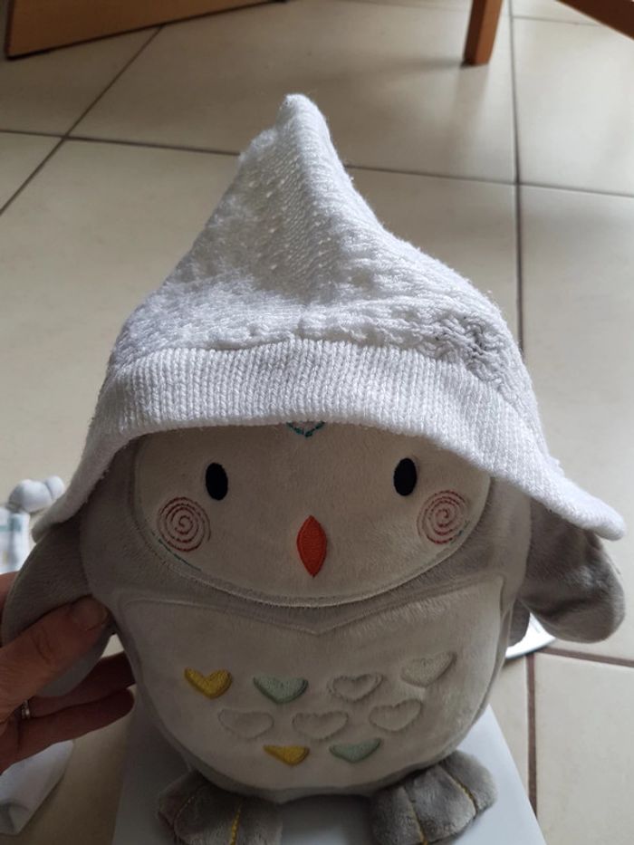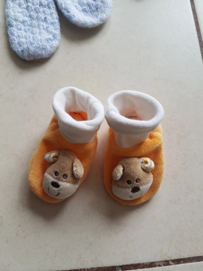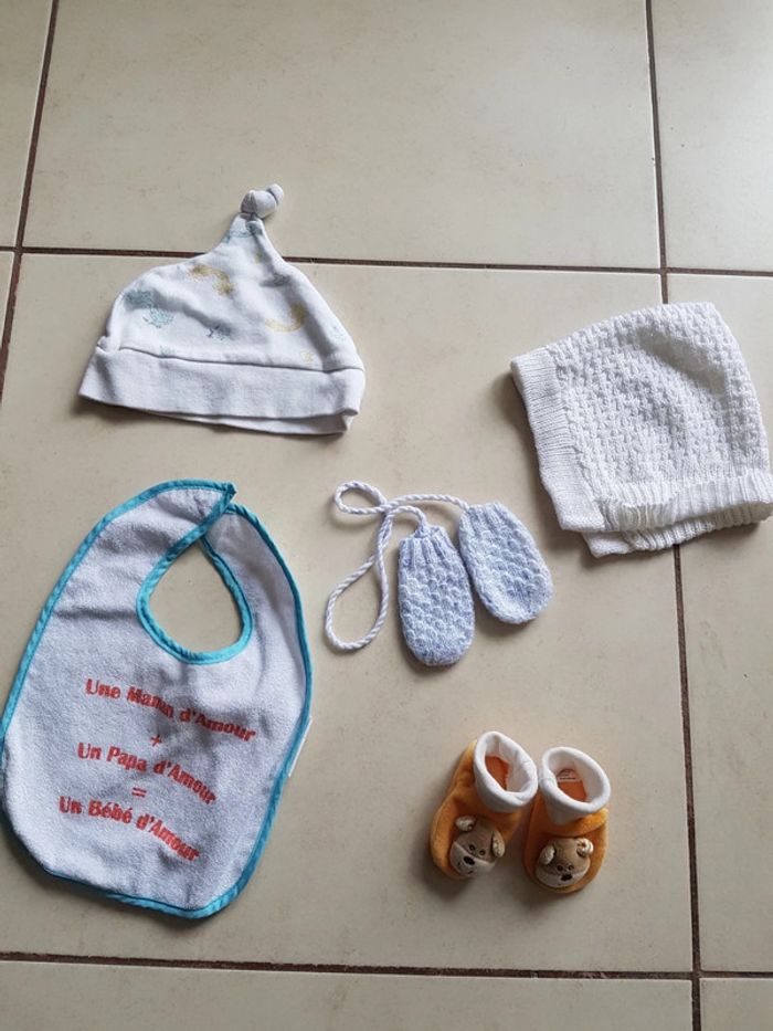 Lot bébé garçon ou fille de naissance à 3 mois composé d'un petit bonnet coton motifs girafes jaunes et menthe, d'un bavoir bleu turquoise et blanc plastifié derrière (parfait quand bébé bave ou régurgite) inscription une maman d'amour + un papa d'amour = un bébé d'amour, une petite paire de moufles, une petite paire de chaussettes-chaussons motifs oursons et un bonnet facile à mettre pour garder les oreilles de bébé bien au chaud ou à l'abris du vent (juste à poser la tête de bébé dessus et refermer : rien à enfiler pour le déranger). 2 euros le lot complet Poids 95g Mes autres annonces du même âge #joeypotter91_garçonnaissance #joeypotter91_garçonunmois #joeypotter91_garçontroismois #joeypotter91_fillenaissance #joeypotter91_filleunmois #joeypotter91_filletroismois
