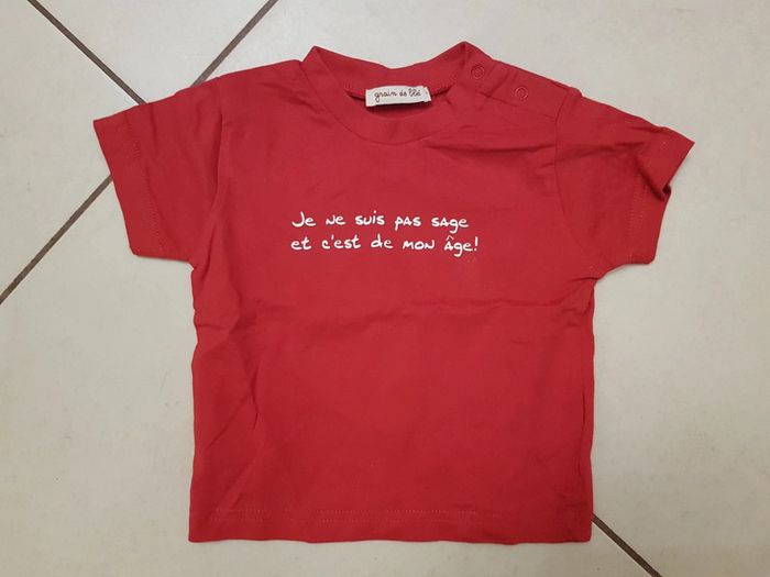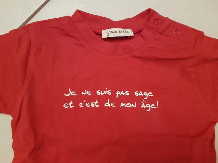 T-shirt garçon taille 6 mois marque grain de blé rouge inscription en blanc "je ne suis pas sage et c'est de mon âge". 2 boutons pression sur l'épaule gauche pour faciliter l'enfilage. Poids 50g Mes autres annonces du même âge #joeypotter91_garçonsixmois [Caisse bleue]