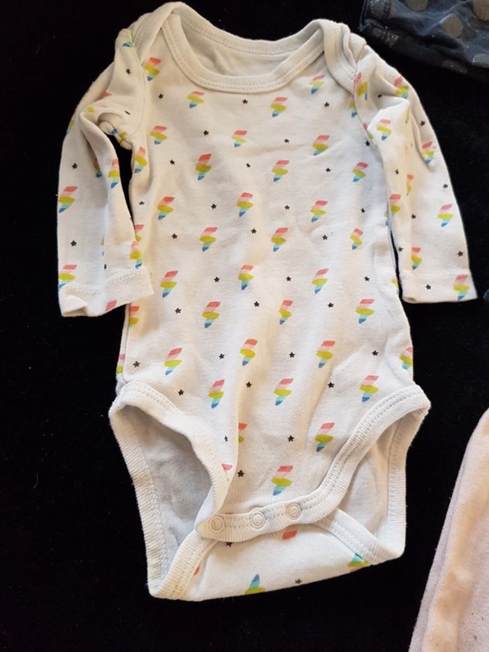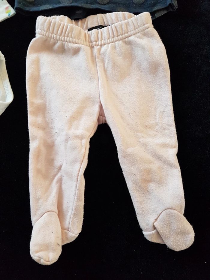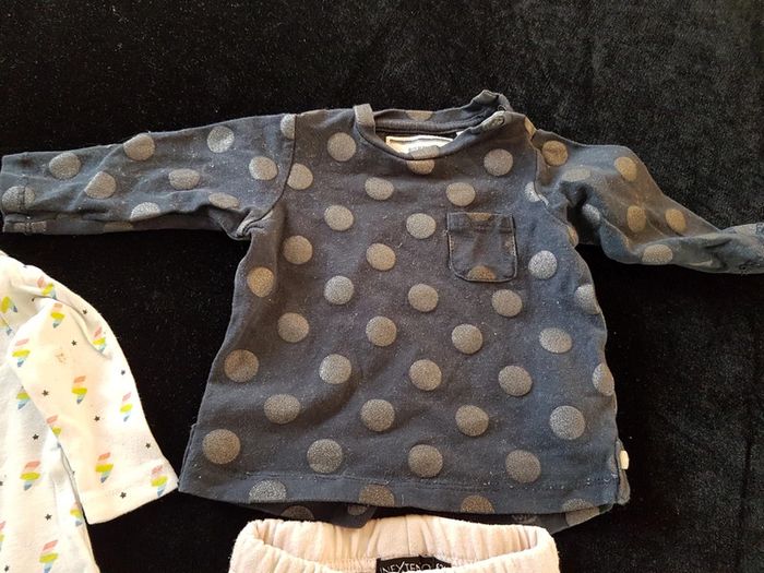 Ensemble tenue fille taille 3 mois composée d'un pantalon avec pieds rose clair taille élastique marque In extenso, d'un body manches longues et d'un t-shirt manches longues bleu à pois argentés marque Tex avec 2 boutons pression sur l'épaule gauche pour faciliter l'enfilage. Poids 160g Mes autres annonces du même âge #joeypotter91_filletroismois
