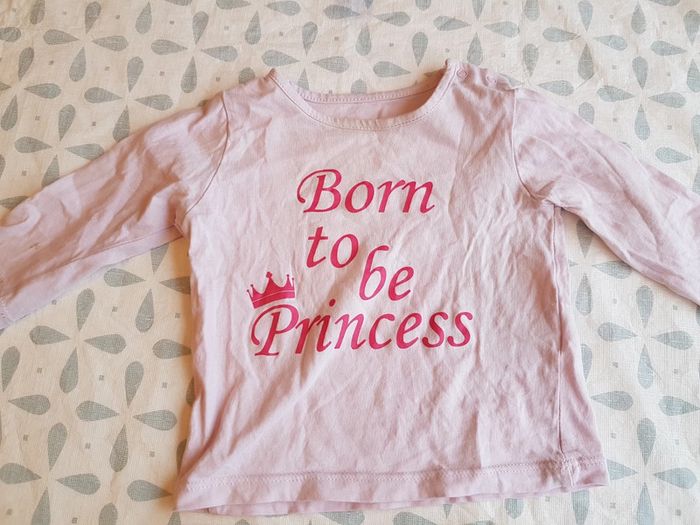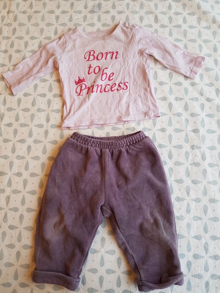 Tenue fille taille 6 mois composée d'un pantalon chaud taille élastique et d'un t-shirt manches longues rose clair avec deux boutons pression sur l'épaule gauche pour faciliter l'enfilage, inscription "born to be Princess". Poids 145g Mes autres annonces du même âge #joeypotter91_fillesixmois [Caisse planètes]