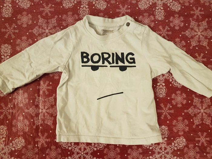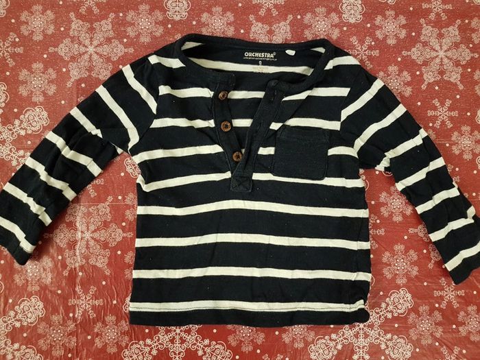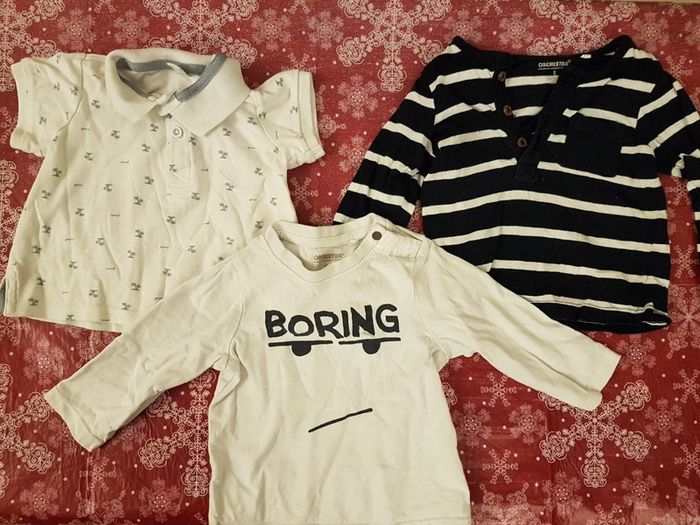 Lot de 3 t-shirts garçon 9 mois composé d'un polo marque tex motif îles, d'un t-shirt manches longues type marinière à rayures bleu marine et blanc marque orchestra et d'un deuxième t-shirt manches longues marque orchestra avec deux boutons sur l'épaule gauche inscription "boring". 1,50 euro le lot soit 50 centimes pièce. Poids 170g Mes autres annonces du même âge #joeypotter91_garçonneufmois