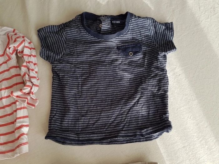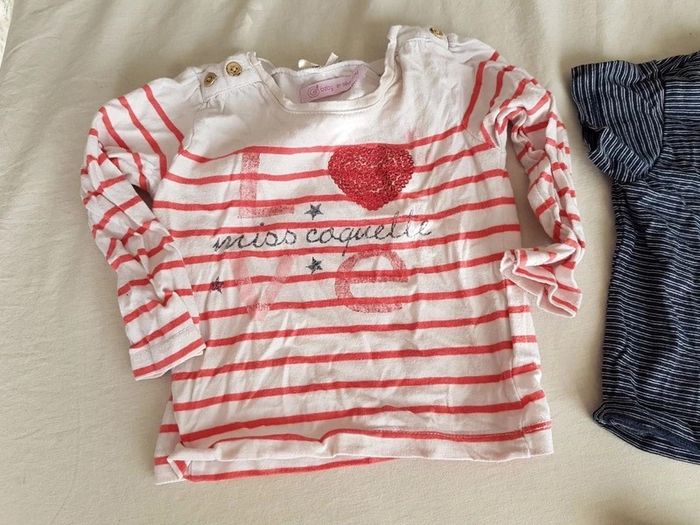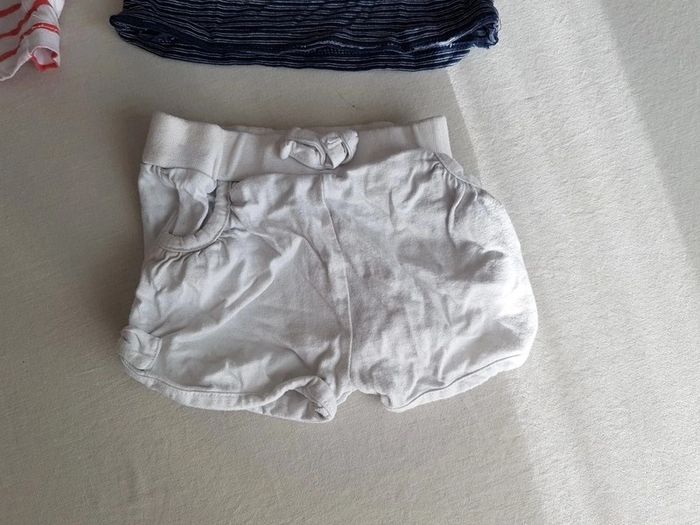 Tenue été fille 12 mois composé d'un petit short blanc taille élastique et nœud, 2 véritables poches et t-shirt manches courtes marque Kiabi bleu marine et blanc. Je donne avec une marinière blanche à rayures oranges Miss coquette love avec perle cœur avec une tâche. Poids 160g Mes autres annonces du même âge #joeypotter91_filledouzemois [Sac bleu]