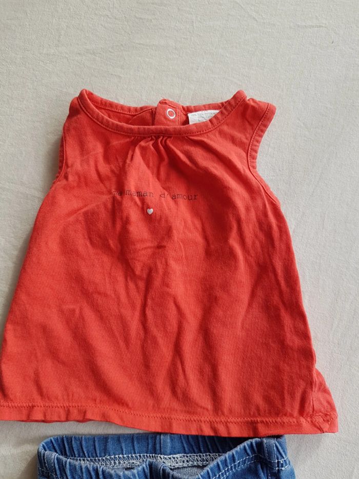Ensemble fille taille 6 mois composé d'un jean taille élastique bleu avec petits nœuds rouges aux chevilles et d'un débardeur rouge assorti avec deux boutons pression dans le dos pour faciliter l'enfilage, inscription ma maman d'amour. Poids 85g Mes autres annonces pour le même âge : #joeypotter91_fillesixmois [Caisse grise]