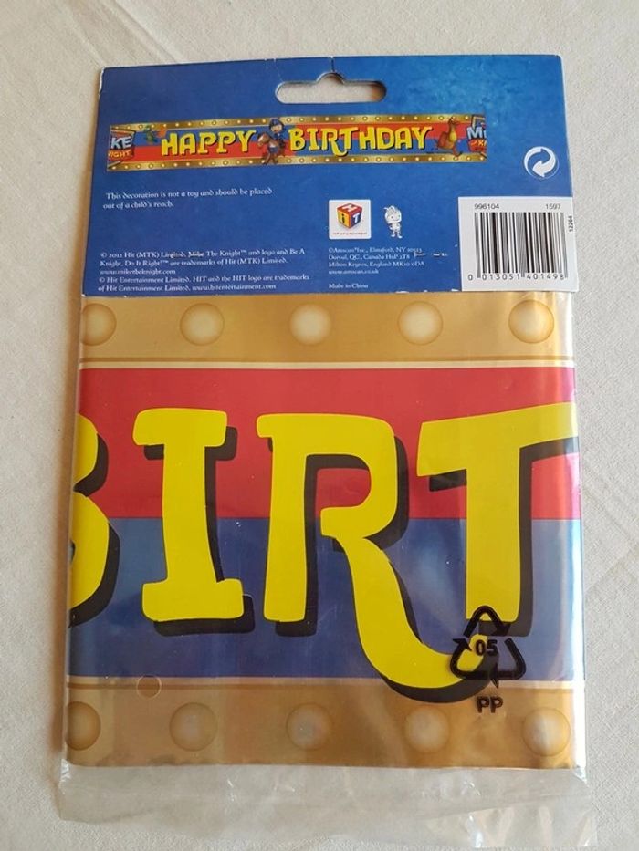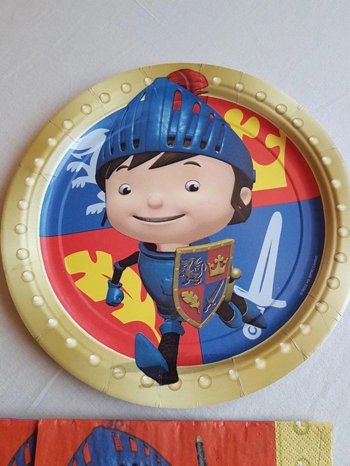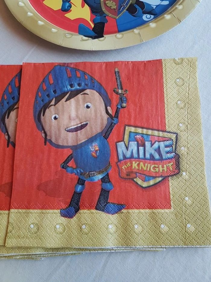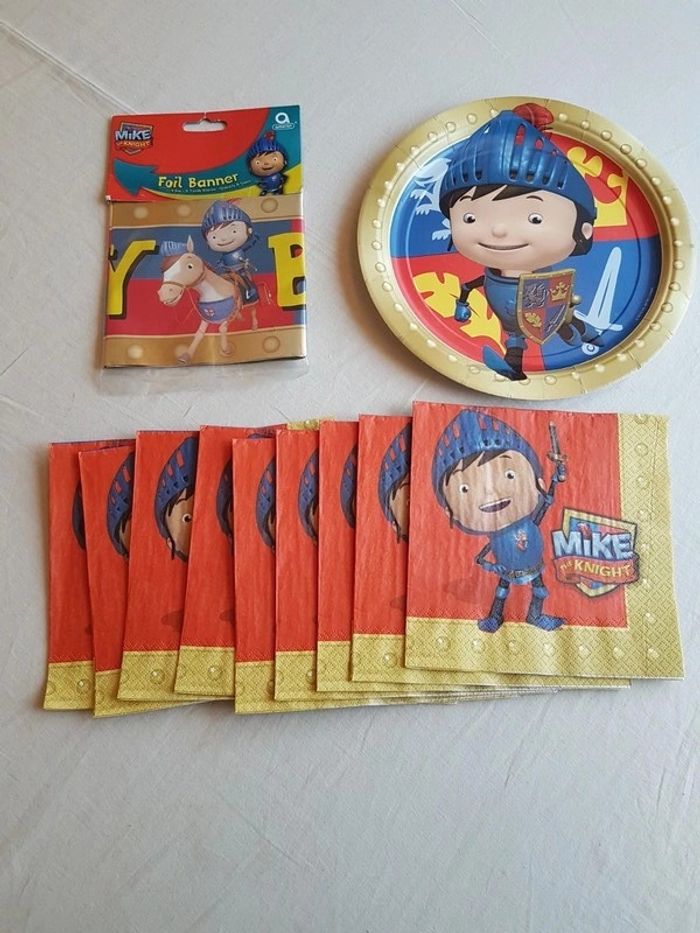Lot chevalier Mike composé de 9 serviettes neuves 16,5 x 16,5 cm, d'une grande assiette en carton pouvant servir de plat diamètre 23 cm et d'une banderole neuve 4,5 mètres. Poids 95g #joeypotter91_garçonquatreans #joeypotter91_garçoncinqans #joeypotter91_garçonsixans #joeypotter91_garçonseptans