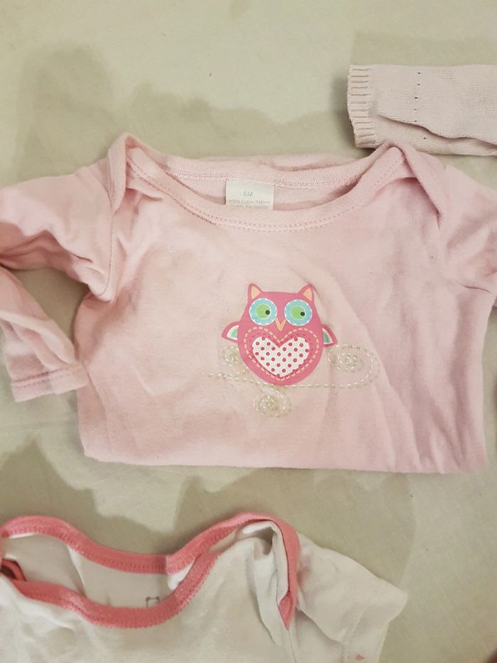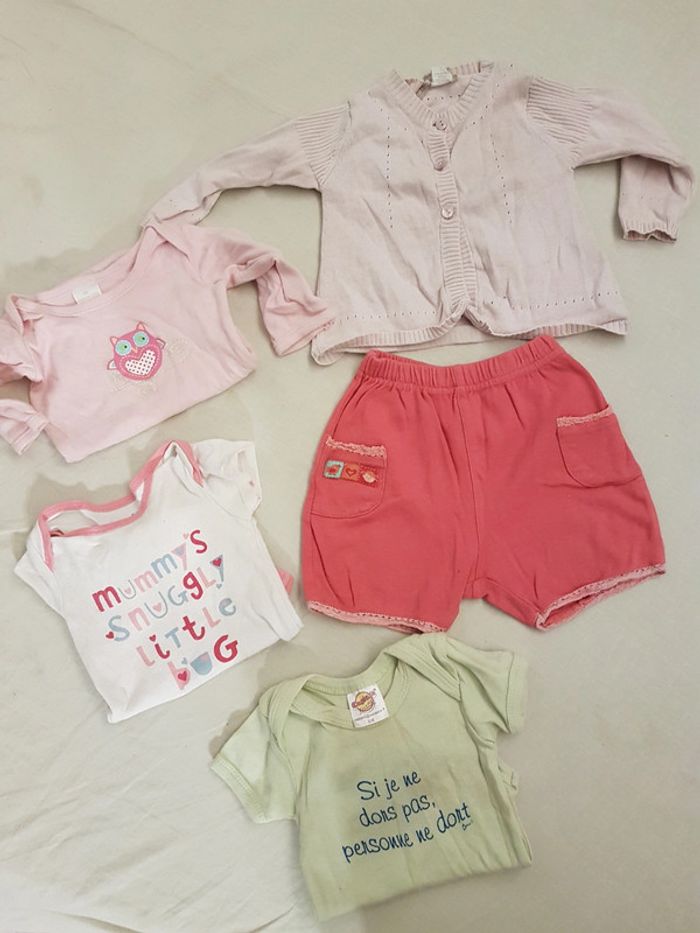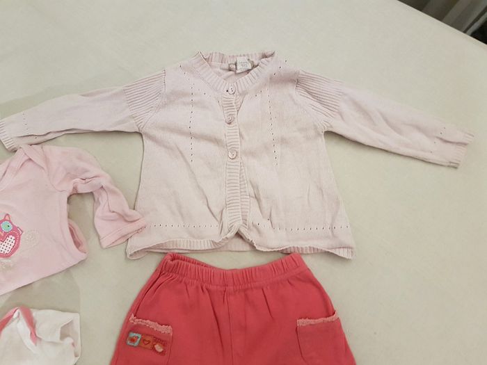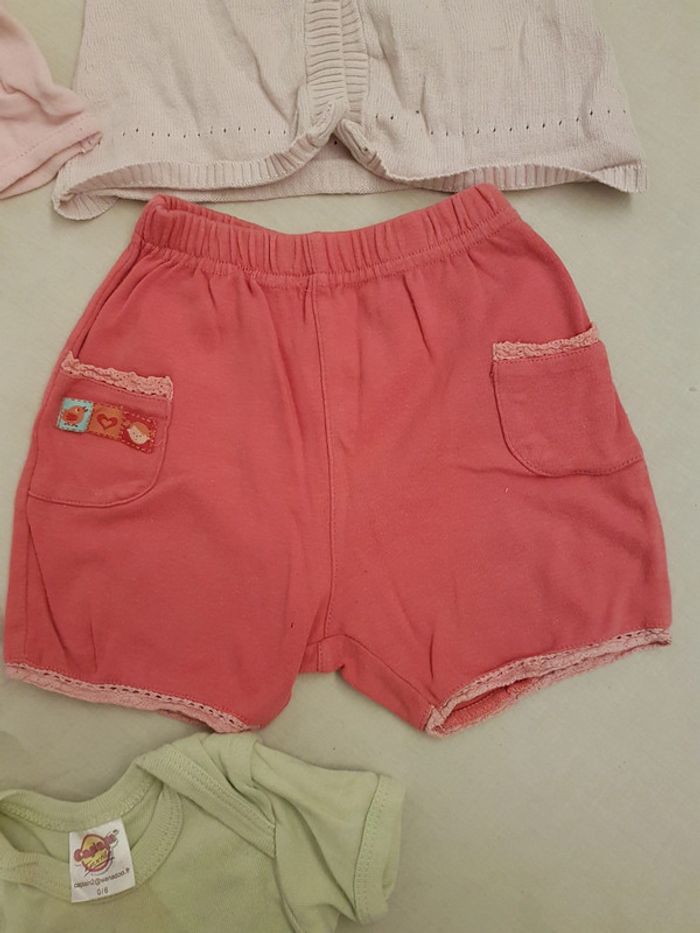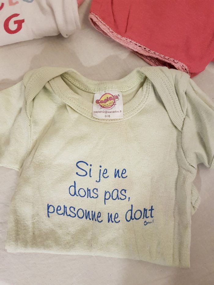 Ensemble fille 6 mois composé - d'un petit short (qui présente un minuscule trou qui se voit à peine mais comme je suis honnête je le précise :)) - d'un petit pull type gilet marque orchestra rose clair - d'un body manches longues motif chouette - d'un body manches courtes inscription mummy's snuggly little bug Je donne avec un body vert clair qui présente quelques petites taches qui partiront peut-être au lavage d'ailleurs inscription "si je ne dors pas personne ne dort". Tellement vrai... :) 2 euros le lot de 6 vêtements. Tout petit prix vu le prix neuf de ces vêtements en magasin. Que pouvons-nous avoir aujourd'hui pour 2 euros ? Poids 270g #joeypotter91_fillesixmois [Sachet dans Grande caisse 6 mois]