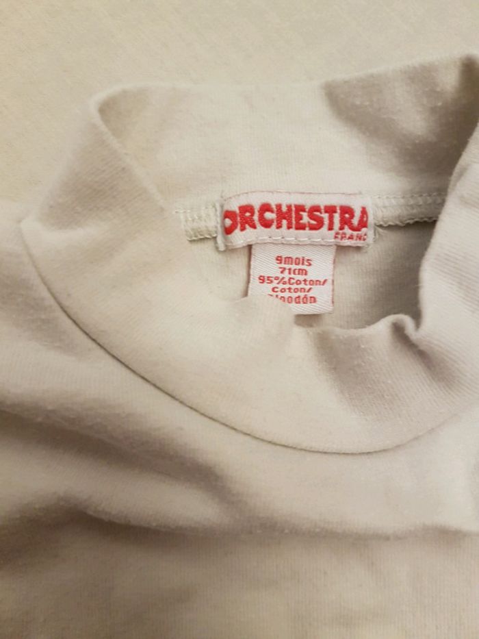 T-shirt manches longues garçon 9 mois marque orchestra avec deux boutons pression sur l'épaule gauche pour faciliter l'enfilage. Couleur beige clair, col légèrement montant permettant de garder la gorge de bébé au chaud. Logo de la marque sur le cœur. Poids 65g #joeypotter91_garçonneufmois