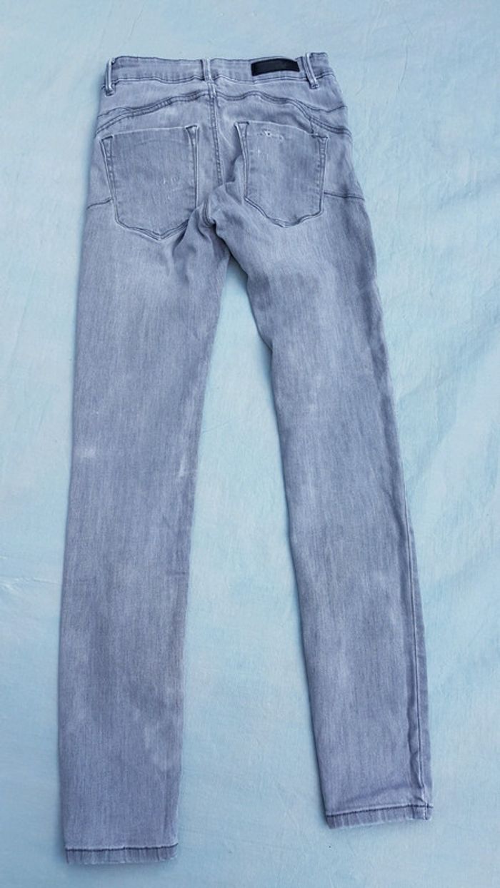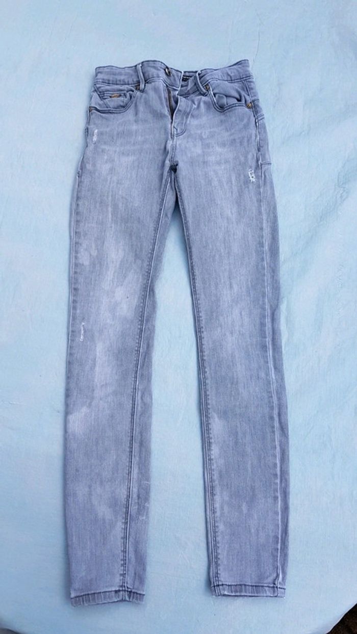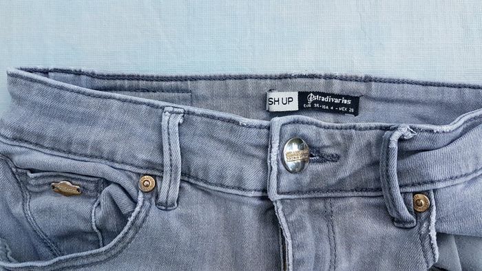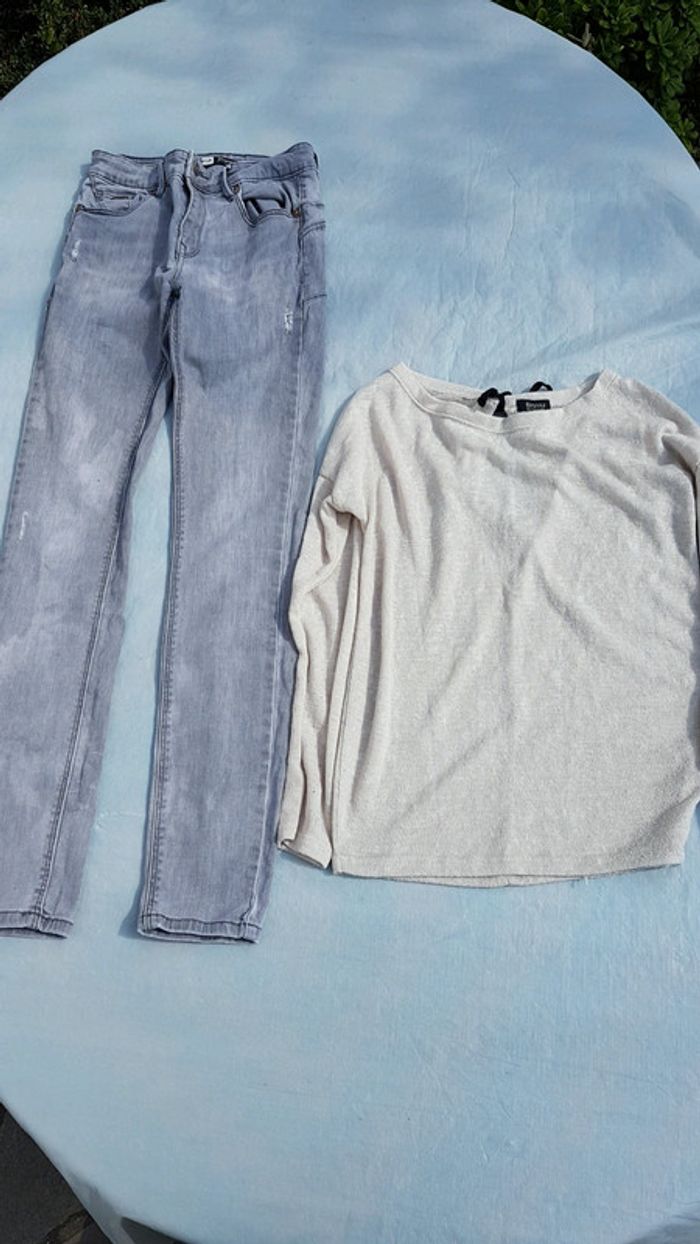 Tenue femme composée - d'un jean gris clair taille 36, bouton et fermeture éclair push up Stradivarius. Déchirures d origine décoratives. Un trou (décoratif ?) dans la poche arrière droite (d'origine?). Une petite trace de stylo qui se voit à peine mais comme je suis honnête je le précise :) - d'un pull fin beige taille XS marque Bershka Collection, lien noir à nouer à l'arrière Poids 500g