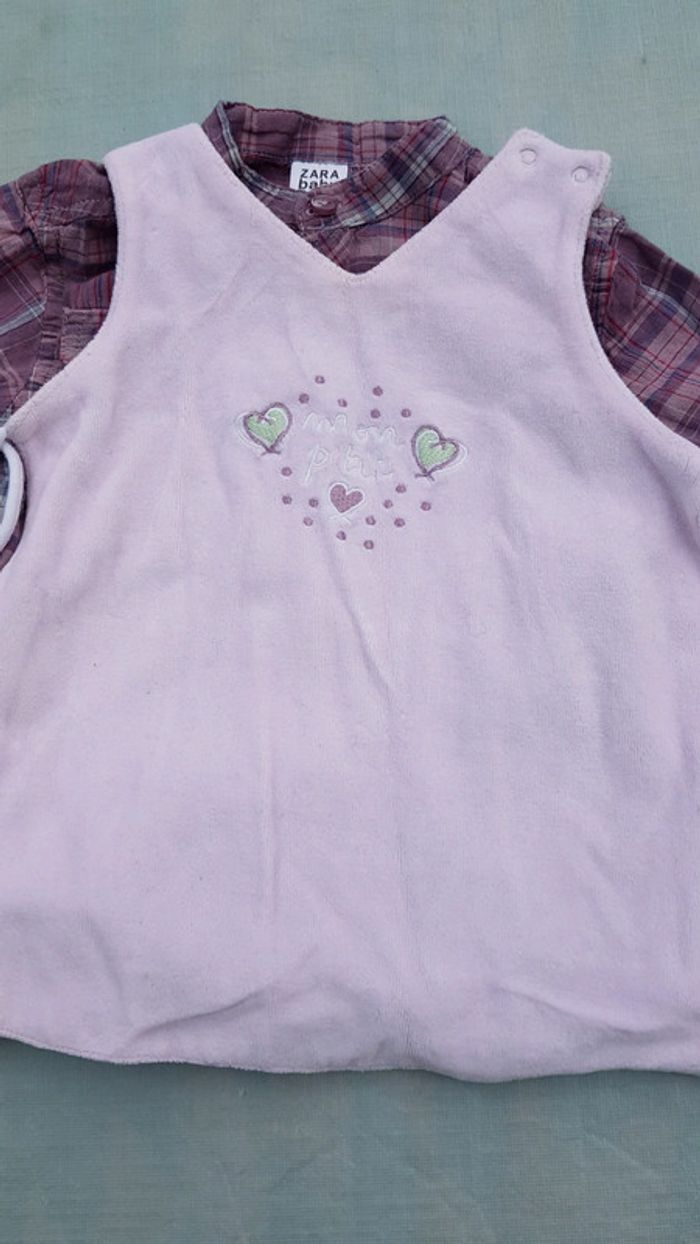Robe taille 9 mois en velours rose clair inscription mon petit cœur marque Colin Coline, très facile à enfiler avec ses deux boutons pression sur l'épaule gauche et des liens à nouer sur les hanches + chemisier marque Zara baby 9-12 mois couleur mauve lilas violet. #joeypotter91_filleneufmois Poids 130 g
