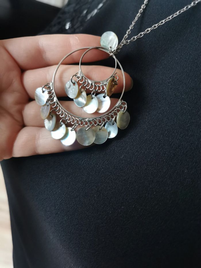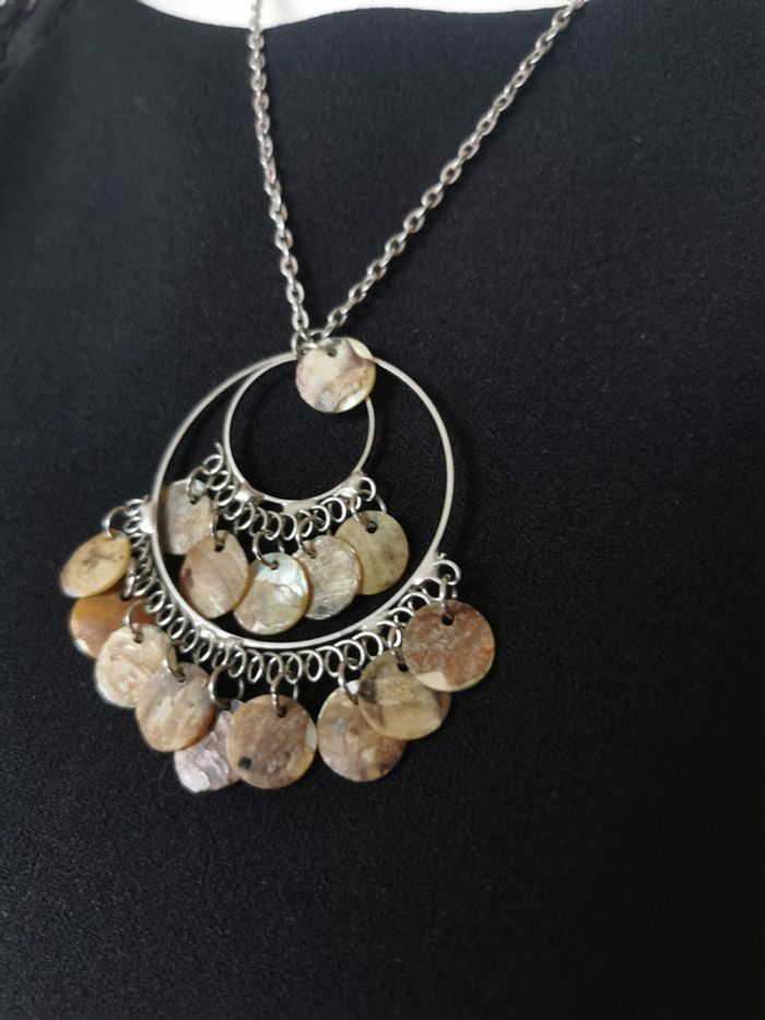 Sautoir créole perles de nacre, chaînette de couleur argenée, en très bon état. Longueur une fois fermé 24-29 cm, poids 10g. Pensez à faire des lots afin de bénéficier des remises que j'ai régulièrement sur ma page. #sautoir #sautoirperlesnacre
