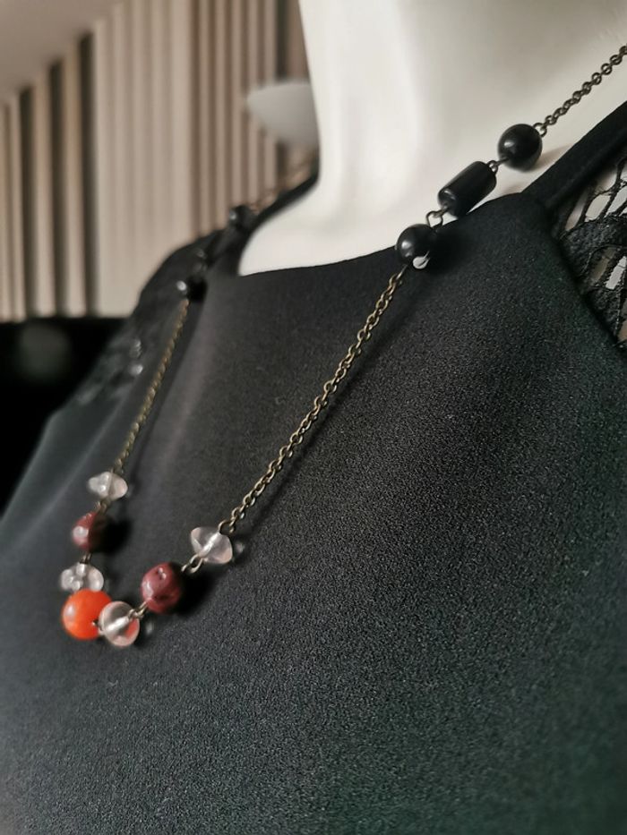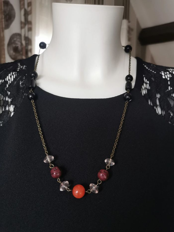 Sautoir de perles noir et rouge chaînette en métal - photo numéro 1