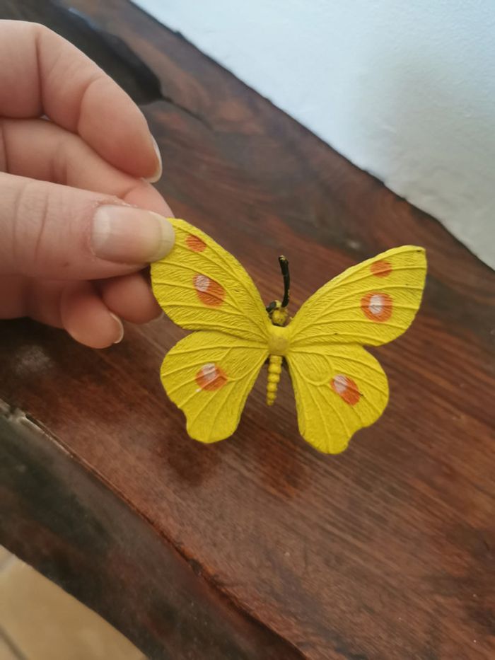 Papillon jaune en plastique souple figurine, avec le petit scratch pour le fixer, en très bon état, taille 6x5 cm, poids 5g. Pensez à faire des lots afin de bénéficier des remises que j'ai régulièrement sur ma page. #papillon #papillonfigurine #papillonjaune
