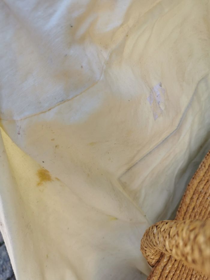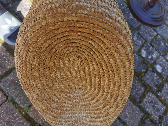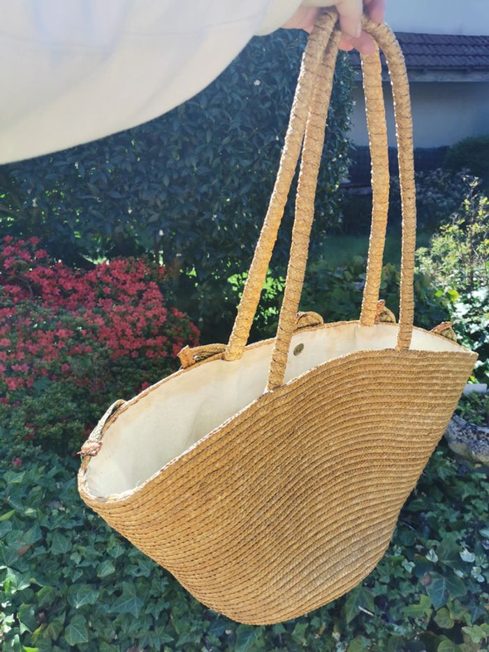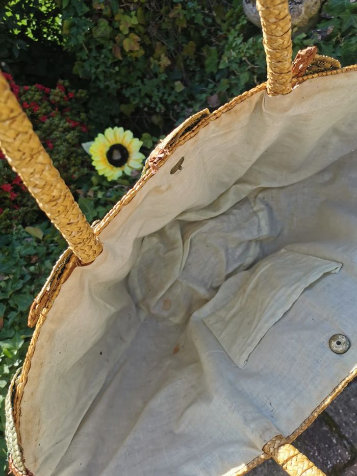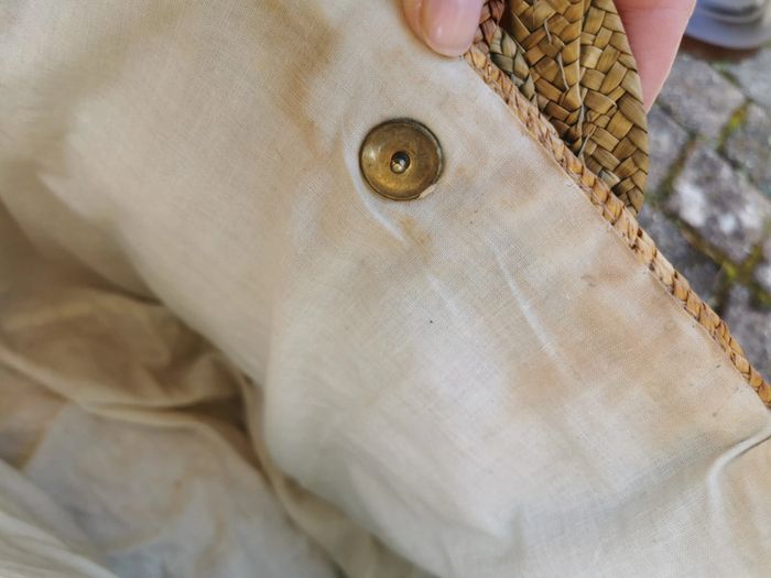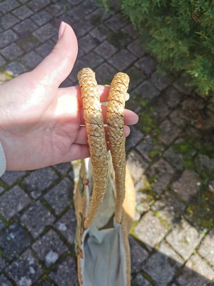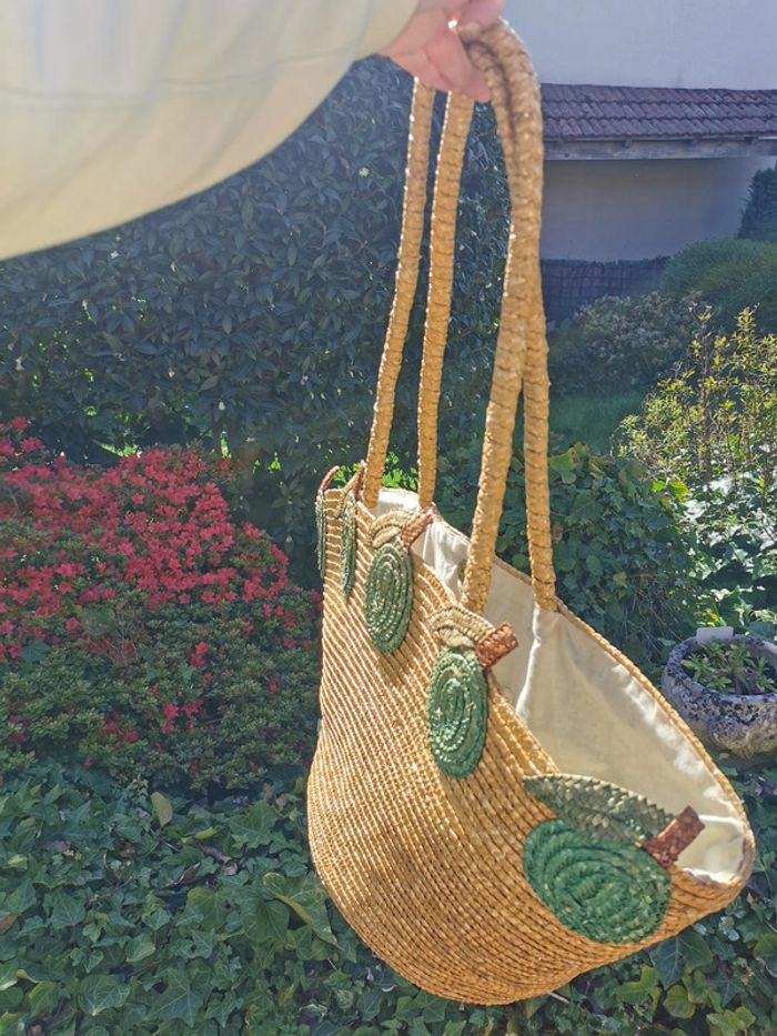Sac cabas en paille beige déco olives vertes. Sac cabas de marché avec de longues anses, extérieur est en très bon état général, sauf une des olives, la paille est sortie, l'intérieur est à remplacer, le tissu en coton est très taché. Dimensions : Largeur : 20 cm Longueur : 62 cm Hauteur : 31 cm Longueur anses : 76 cm Poids : 470g Pensez à faire des lots afin de bénéficier des remises que j'ai régulièrement sur ma page. #sacacabas #sacenpaille #sacdemarche #cabasenpaille #cabasdemarche
