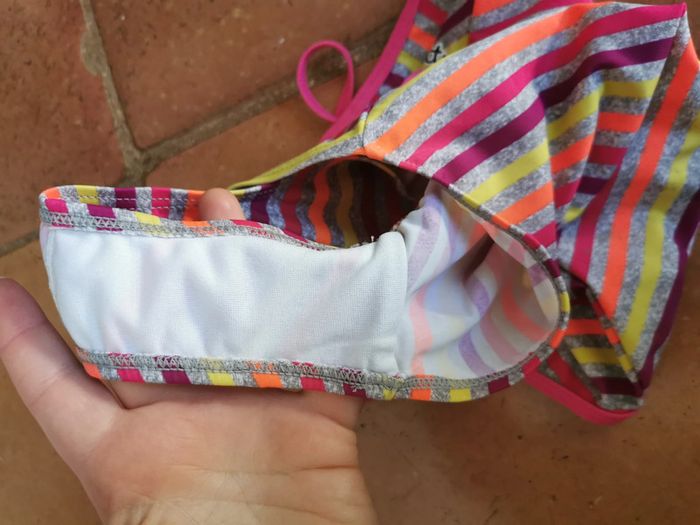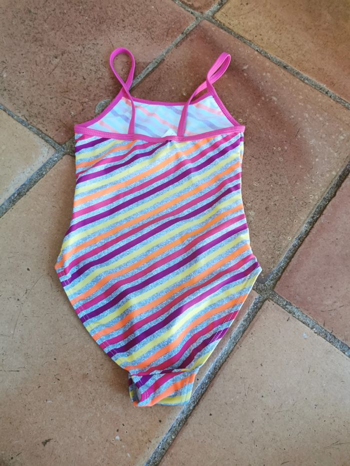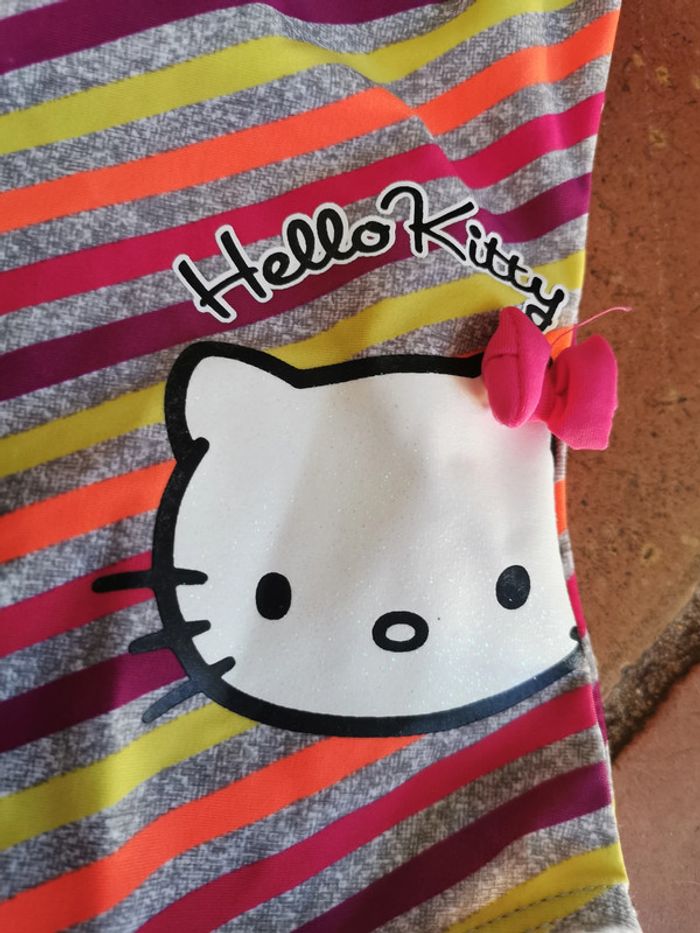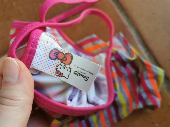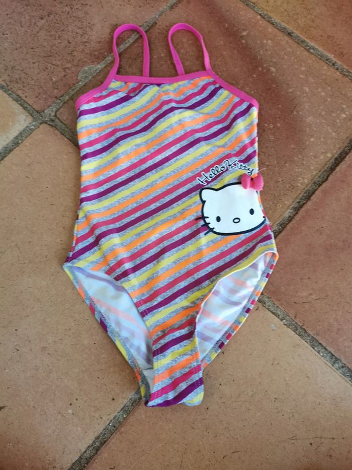 Maillot de bain Hello Kitty, une pièce, rose fuschia à rayures orange, rose et jaune sur le fond gris, en très bon état, il n'y a plus d'étiquette de taille, marque Sanrio. Mesures : Longueur : 30,5 cm Longueur bretelles : 26 cm Largeur dos entre les aisselles : 23 cm Largeur taille : 21 cm Largeur hanches : 22 cm Poids 48 g. Pensez à faire des lots afin de bénéficier des remises que j'ai régulièrement sur ma page.