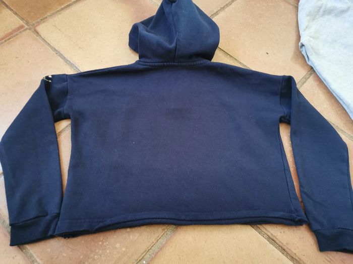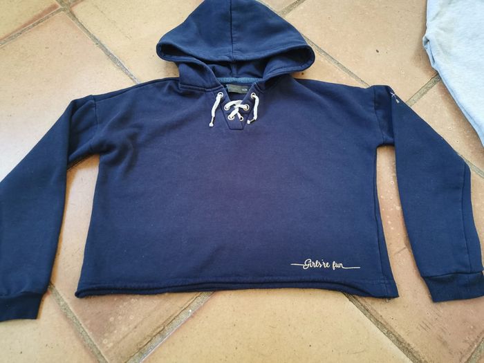 1. Sweat bleu marine à capuche, manches longues, marque I ❤️Firefly, taille 10 ans. Sweat court type crop top. Manches tombantes ,en coton. Mesures :