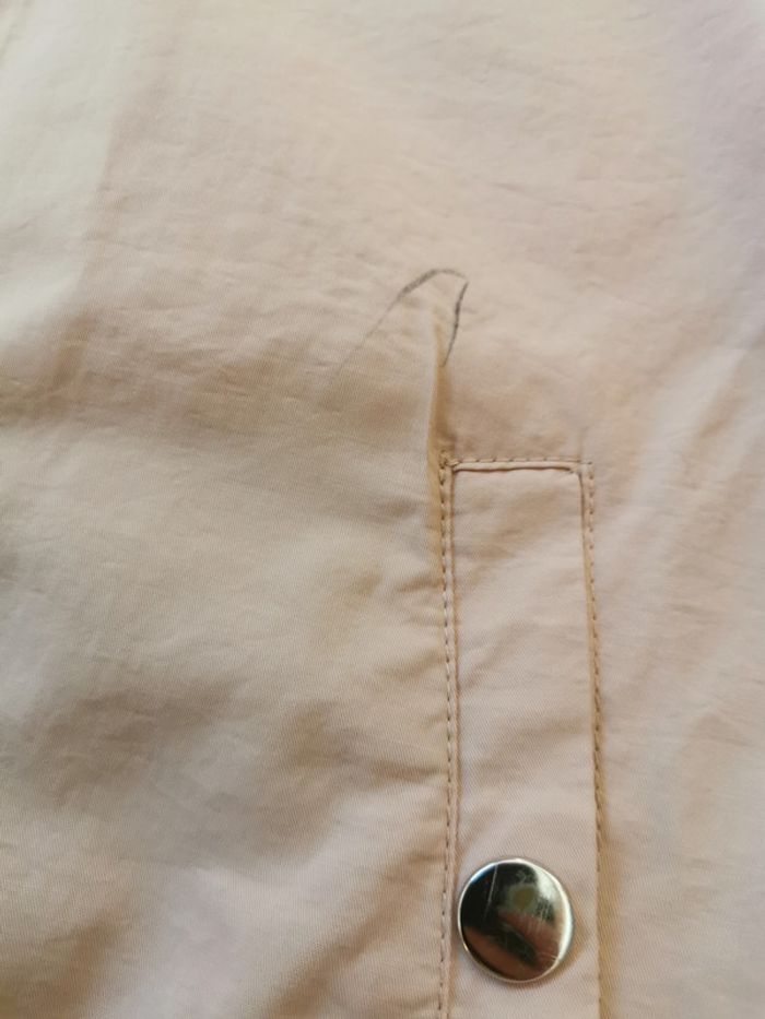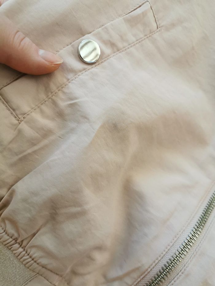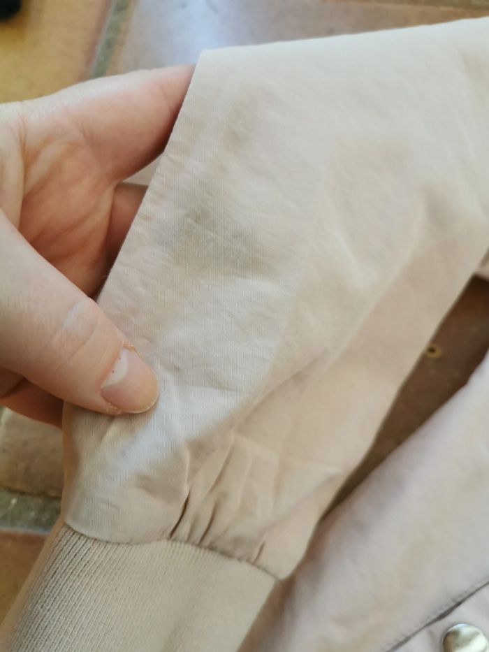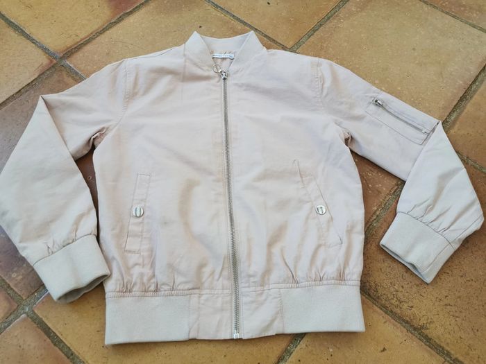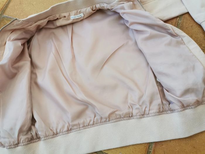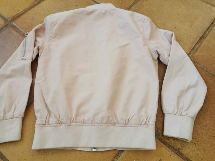 4. Veste rose clair, marque Monoprix teens, taille 10 ans/129-140 cm, composition extérieur 51 % coton, 49% polyester, doublure 100% polyester. Belle veste, mais tachées par des coups de stylo au dessus de la poche, les manches sont également un epu tachées, fermeture à zip, avec deux poches. Meusres : Longueur : 51 cm