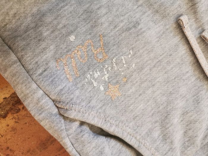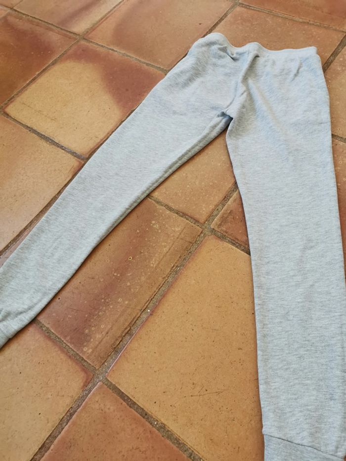 2. Jogging gris, taille 10 ans/138/143 cm, marque Kiabi, en coton, en bon état, le motif sur la poche est partiellement effacé. Mesures :