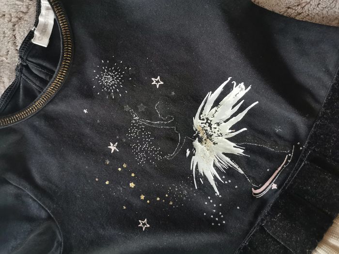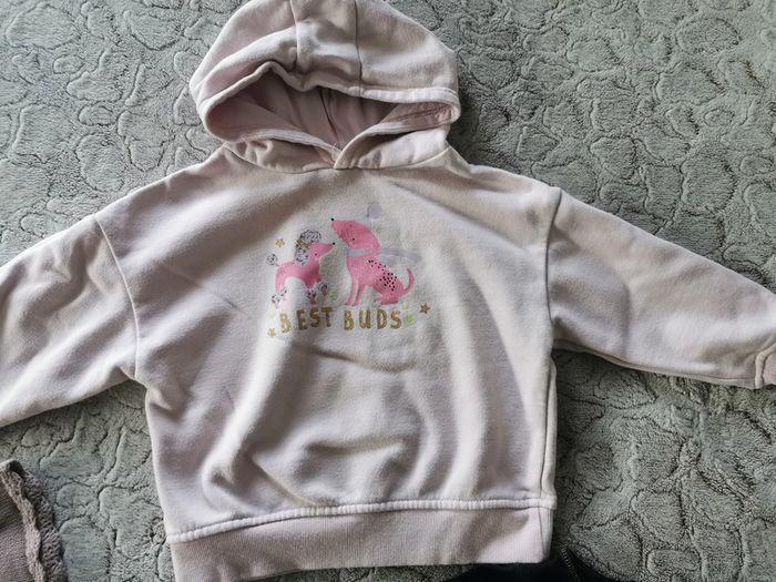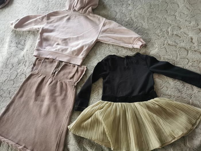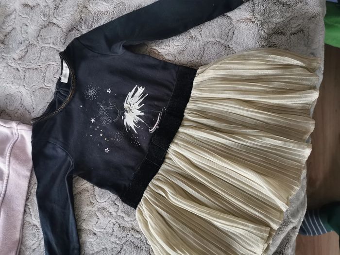 Lot de robes et 1 sweet bébé 24 mois. Le lot n'est pas dissociable et comprend : -1 robe manches longues, tissu très agréable sur le haut du corps, type t-shirt noir avec une ballerine, la jupe est en polyester doré, marque Orchestra, taille 2 ans/92 cm, composition ù 95% coton, 5% élasthanne, TBE -1 petite robe couleur vieux rose au tricot, marque Bout'chou, taille 24 mois/86 cm, composition : 100% coton, en TBE - sweet rose à capuche, manches longues Best Buds, composition : 60% coton, 40% polyester, taille 2-3ans/98 cm, marque Primark, en BE, un peu taché devant. Poids du lot 461g Pensez à faire des lots afin de bénéficier des remises que j'ai régulièrement sur ma page. #robe24mois #robeorchestra #vetementsbebe #vetements24mois #vetements2ans #vetements3ans #sweetprimark