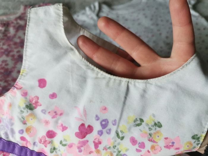 Robe, t-shirt et un bodie 12-18 mois, le lot en état satisfaisant, comporte des pièces tachées, n'est pas dissociable. Le lot comprend : - 1 robe blanche à fleurs, en coton, tachée, doublure polyester, mais très jolie, taille 12/18 mois - 1 bodie en coton blanc à motif fleures, manches courtes, en TBE - 1 t-shirt en coton beige à fleurs roses, manches courtes, en TBE Poids du lot 214g Pensez à faire des lots afin de bénéficier des remises que j'ai régulièrement sur ma page. #lotvetements #lotbebe #vetementsbebe #robe12mois #tshirt12mois