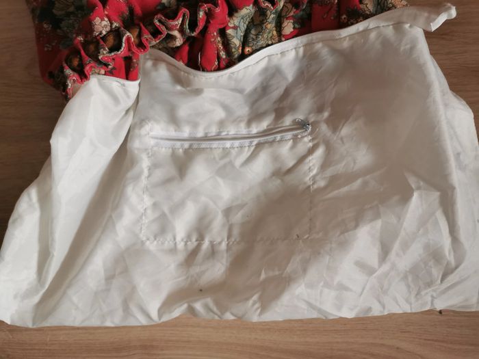 Sac en tissu de coton rouge imrimé avec les anses en perles de bois (usées), l'intérieur du sac est en polyester blanc à remplacer car taché (les taches ne sont pas parties après la lessive), la fermeture éclair est à remplacer, car il n'y a plus de poussoir, le prix comprends ses défauts. Mesures : Hauteur : 35 cm Largeur : 13 cm Longueur : 59 cm Poids : 310g #sacencoton #sactissu #sacansesperlesdebois