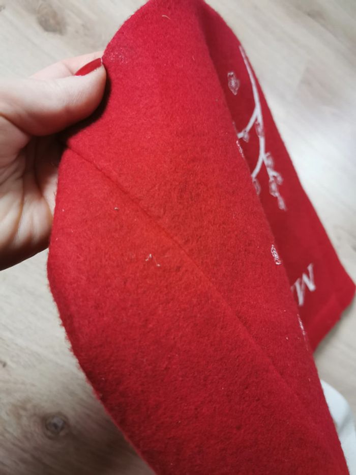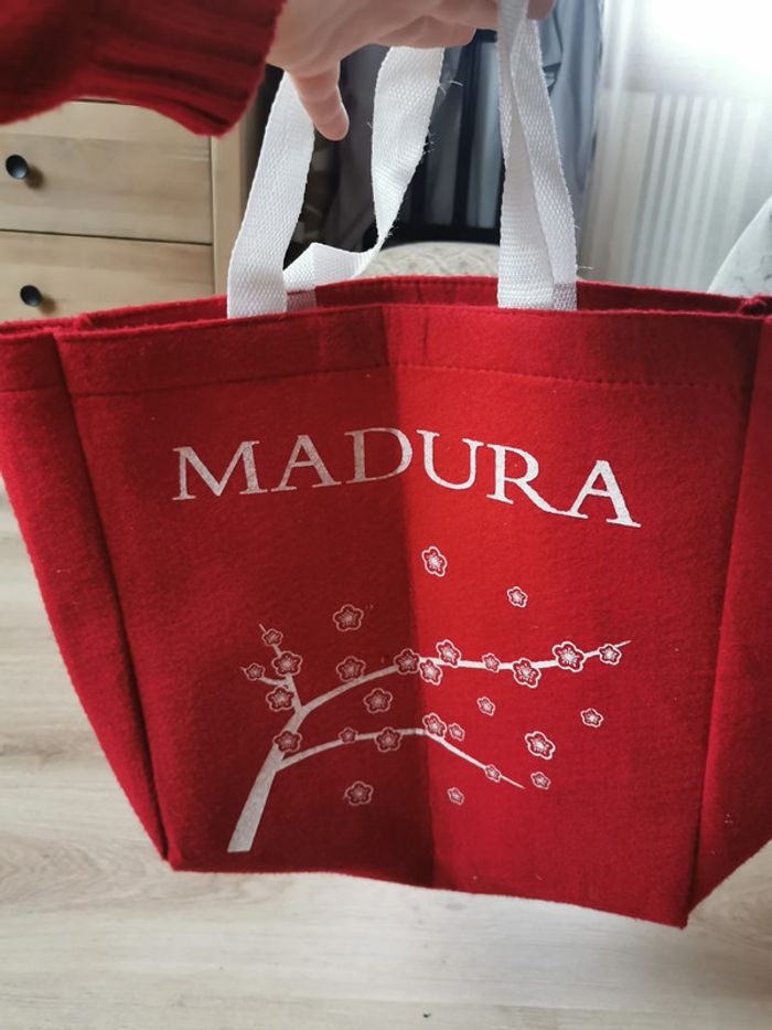 Sac de marché ou sac cabas en feutrine rouge avec les motifs à fleurs et inscription Madura en blanc et les poignées blancs aussi. Sac en très bon état général. Dimensions : Longueur : 31 cm Hauteur : 31,5 cm Epaisseur : 11 cm Poids : 80g #sacrouge #sacacabas #sacmadura #sacdemarche #sacfeutrine