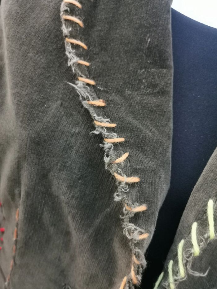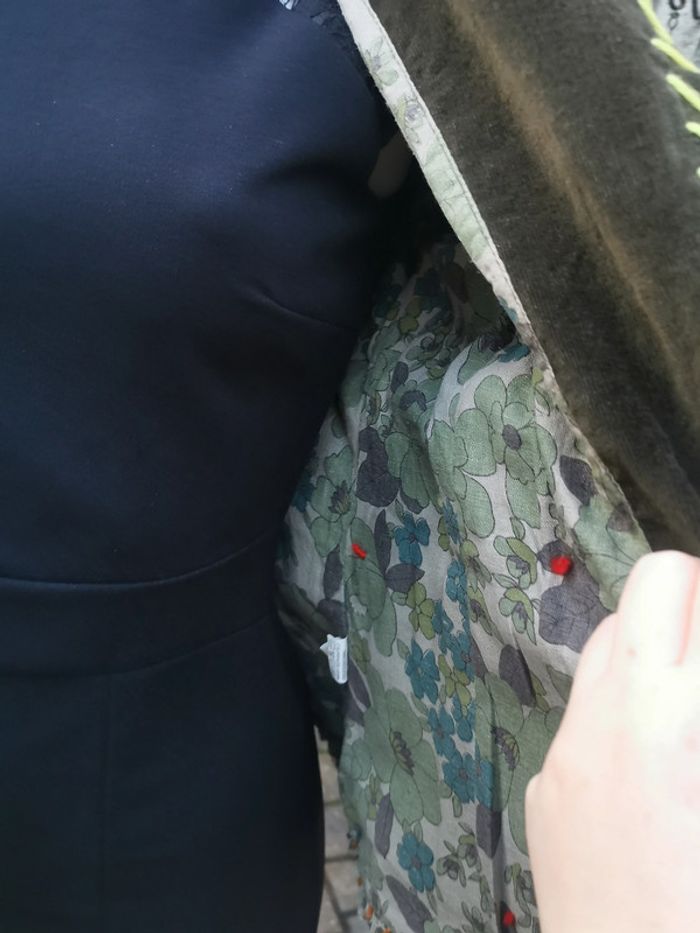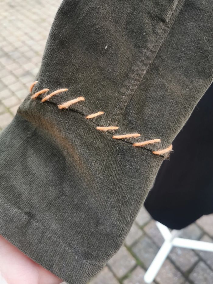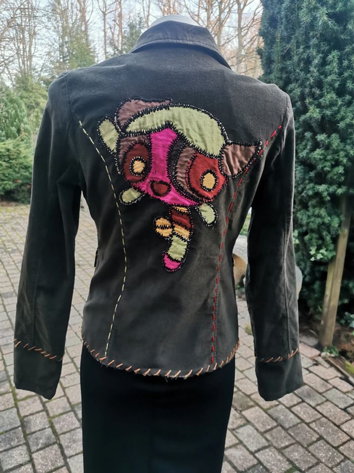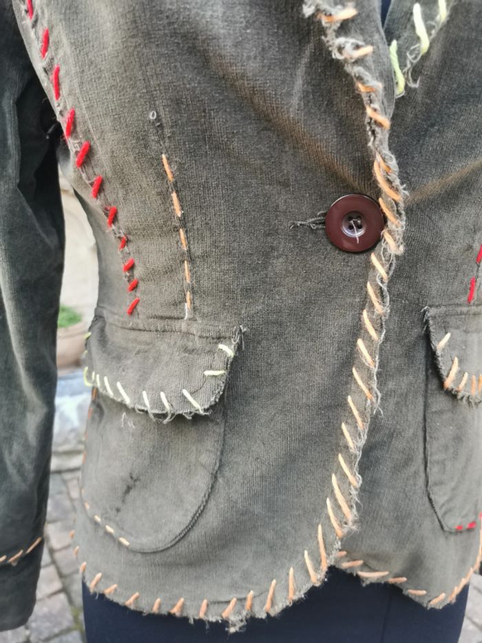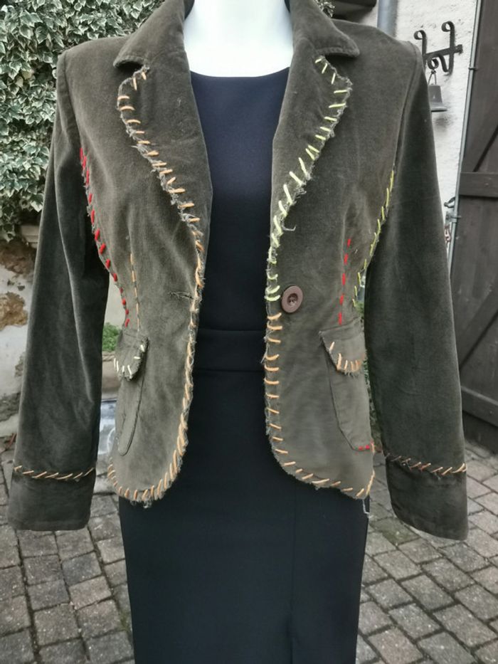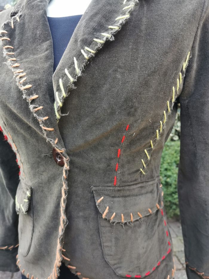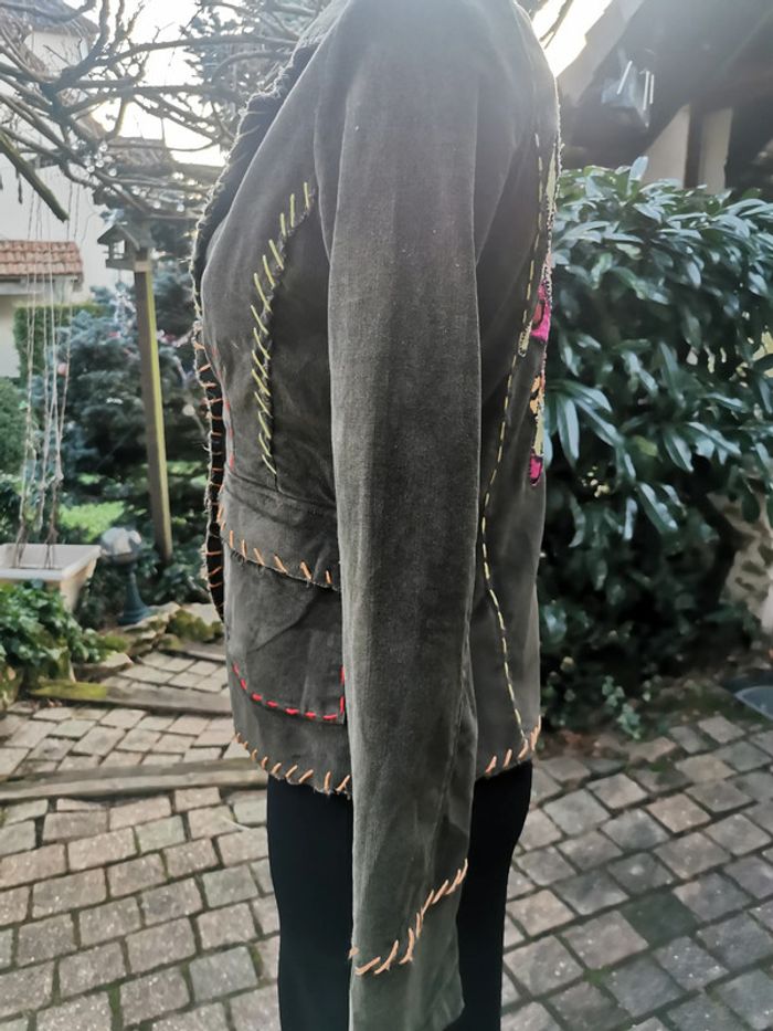 Veste marron en coton et velours cotelé patchwork animal au dos. Jolie veste original en velours cotelé très fin de couleur marron/kaki avec les surpiqûres apparentes comme de la broderie, deux poches devants et au dos une application animal en patchwork. L'intérieur de la veste est en coton à imprimé floral, veste est cintrée, se ferme par un bouton à la taille, taille L, en très bon état général. Veste type tailleur. Mesures : Longueur veste : 57,5 cm Longueur manche depuis l'aisselle : 47 cm Longueur manche depuis l'épaule : 64 cm Largeur dos épaules : 38 cm Largeur dos aisselles : 47 cm Largeur taille : 42 cm Largeur hanches : 47 cm Poids : 600g *Mannequin fait la taille 36 #veste #vestetailleur #vestevelourscotele #vestebrodee #vestepatchwork