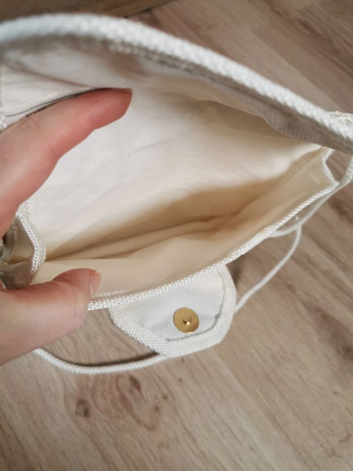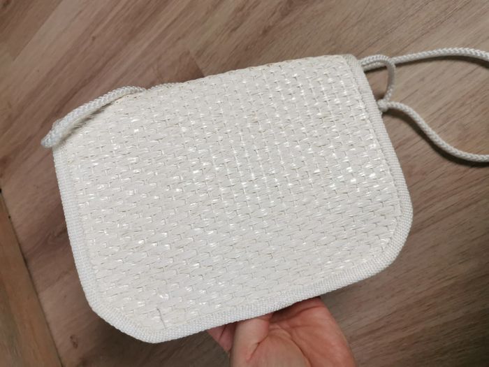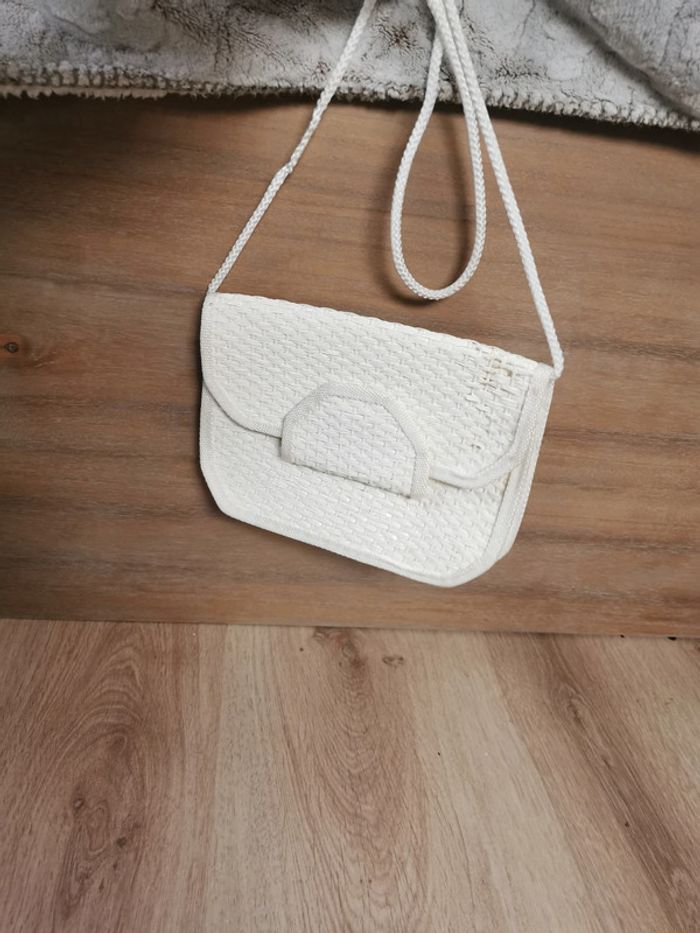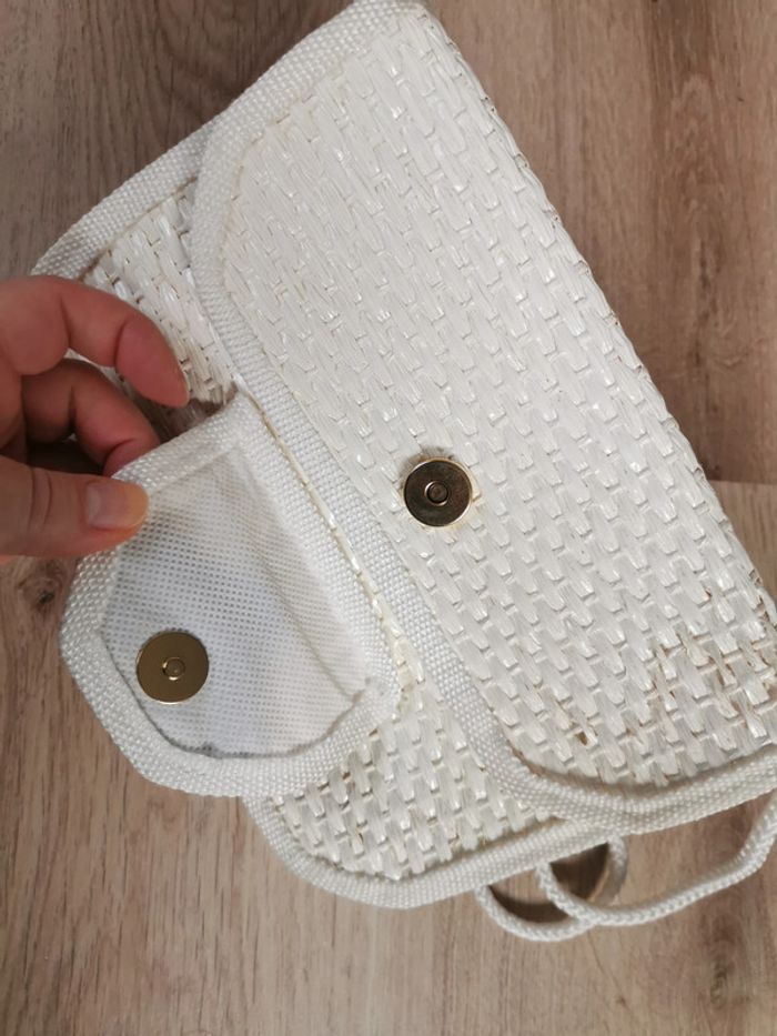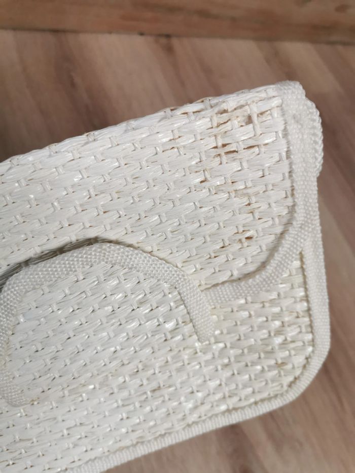 Sac à main blanc en raphia. Sac pochette à rabat se fermant par un bouton pression, la bandoulière lacet, fabriqué en Italie, vintage, en bon état général, un côté de rabat est abîmé (voir les photos). Dimensions : Hauteur : 16,5 cm Longueur : 22,5 cm Epaisseur : 3 cm Poids : 99g #sacblanc #pochetteblanche #sacraphia #sacraphiablanc #pochetteraphiablanc #sacmadeinitaly #sacevintage