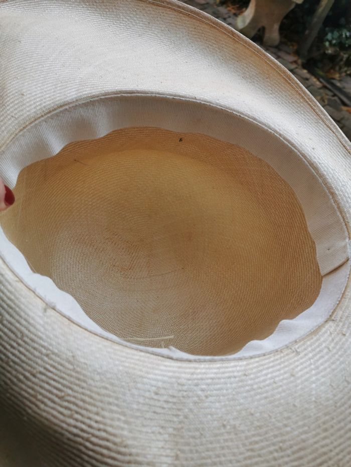 Capeline chapeau décoré de fleurs à bords inégaux, chapeau de paille naturelle, les fleurs sont en tissu fixées sur le ruban en satin (les fils de fixation sont un peu visibles) vintage, en très bon état. Mesures : Tour de tête : 55 cm Hauteur : 10 cm Bords : 10-14 cm Poids : 70g #capelinefleurs #capeline #chapeaudepaille #chapeauvintage #chapeau