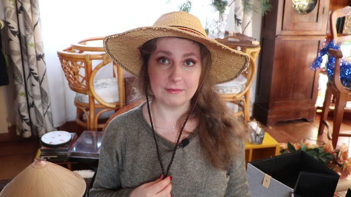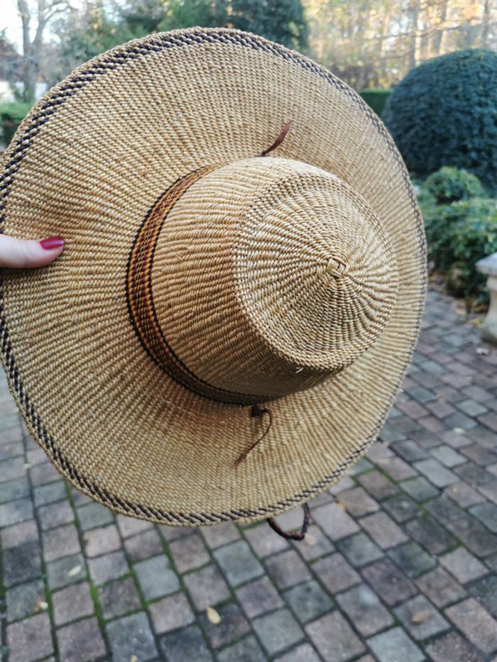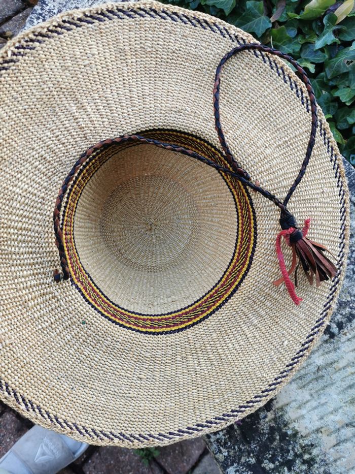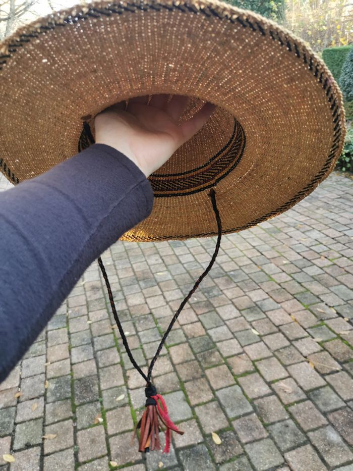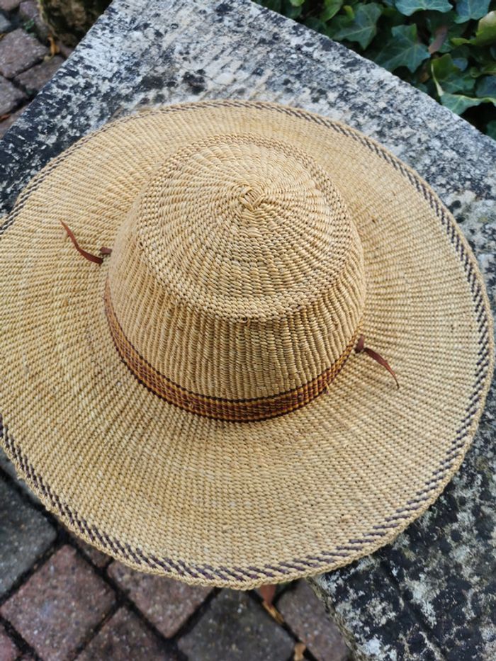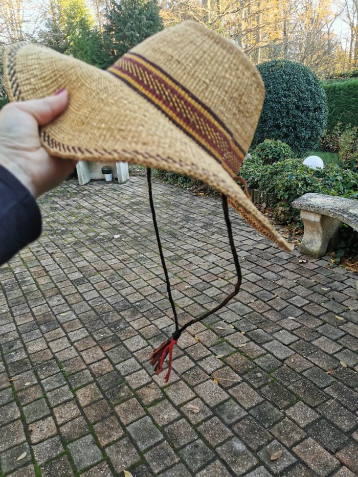 Chapeau en raphia beige à bords larges avec la corde en cuir tressé, les contours des bords sont marrons bordeaux. En très bon état. Mesures : Hauteur : 10 cm Tour de tête : 57 cm Bords : 10 cm Poids : 165g. #chapeauenraphia #chapeaucorde #chapeaubeige