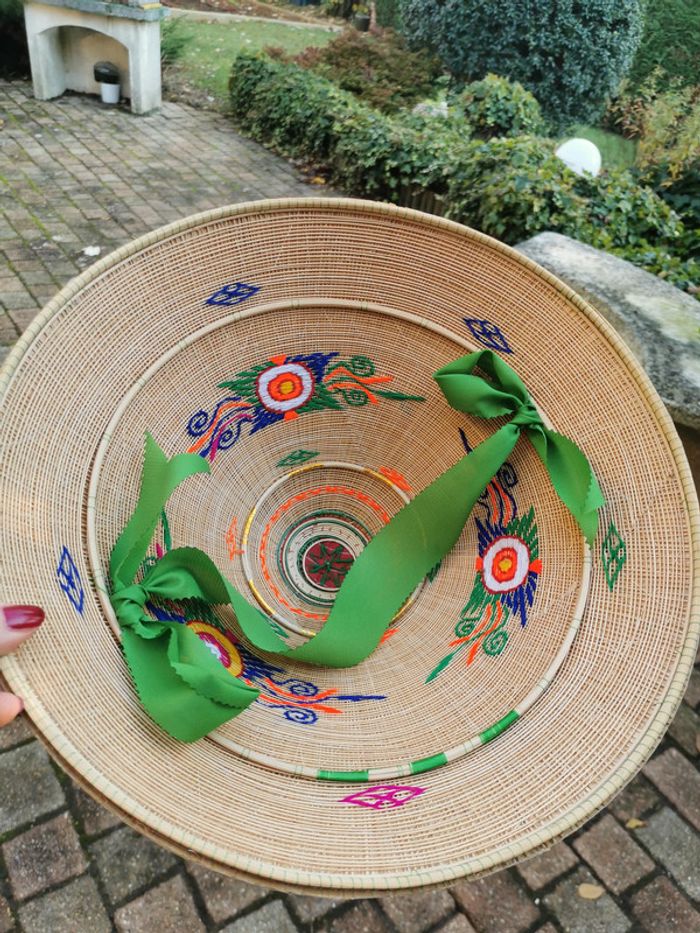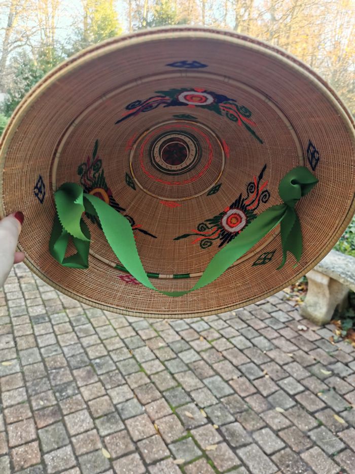 Chapeau de rizière en paille. Chapeau conique asiatique de paille, brodé à l'intérieur très coloré avec le ruban vert. Beau chapeau de rizière, en très bon état, comme neuf. Mesures : Hauteur : 20 cm Diamètre : 36 cm Poids : 110g #chapeauderiziere #chapeauasiatique #chapeaudepaille #chapeautraditionnel #chapeauneuf