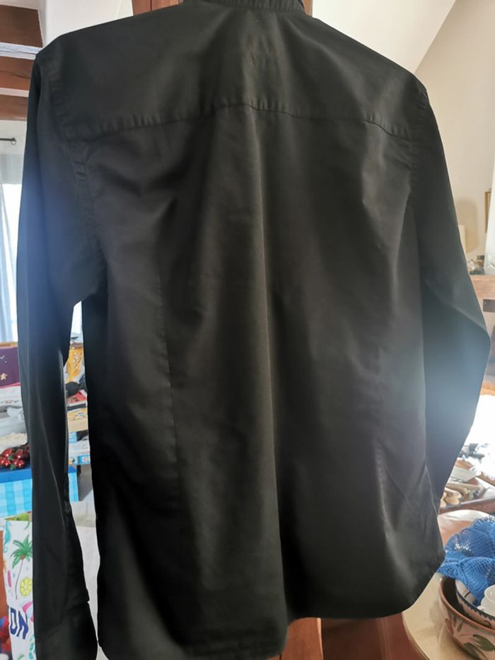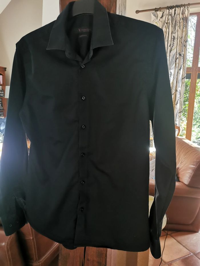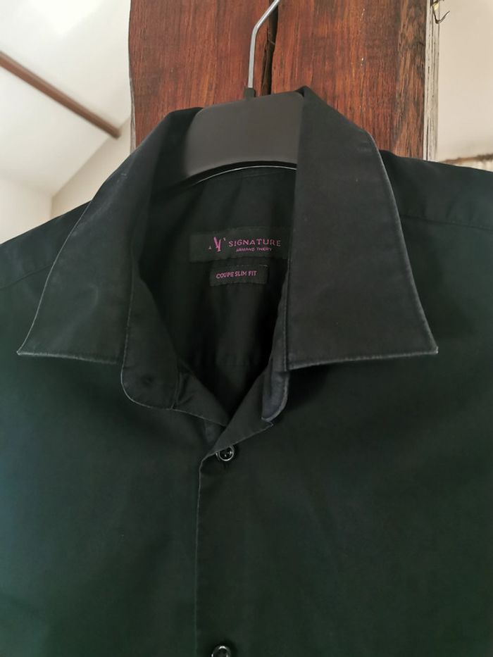 Chemise noir pour homme coupe slim fit, taille 5 (43-44), signature Armand Thiery. Chemise manches longues en coton, en très bon état général, un peu perdu de son intensité en couleur surtout au niveau des coutures, visibles sur les photos. Mesures : Longueur : 77 cm Largeur dos entre épaules : 48 cm Largeur dos entre aisselles : 55 cm largeur taille : 49,5 cm Longueur manche depuis l'aisselle : 56 cm Longueur manche depuis l'épaule : 65 cm Poids : 250g #chemisenoire #chemisehomme #chemiseslimfit #chemisearmandthiery #chemisetaille5 #chemisetaille44 #chemisenoircoton #chemisecoton #chemisemancheslongues