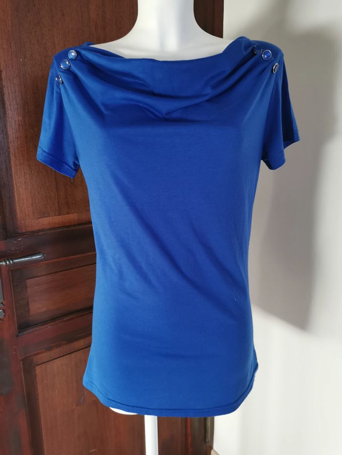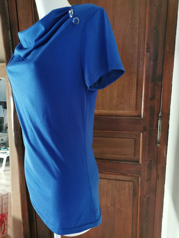 T-shirt long bleu éléctrique boutons argentés sur les épaules, décolté en plis. En très bon état général, taille 36/38, composition : 95% viscose, 5% élasthanne. Mannequin fait la taille 36/38. Mesures : Longueur : 69 cm Largeur dos entre les épaules : 43 cm Largeur dos entre les aisselles : 48 cm Largeur taille : 41 cm Poids : 145g #tshirtbleuelectrique #tshirtbleu #tshirtlong