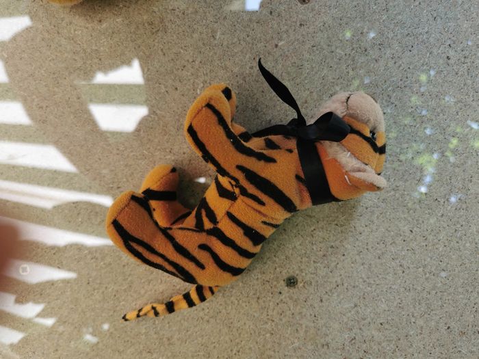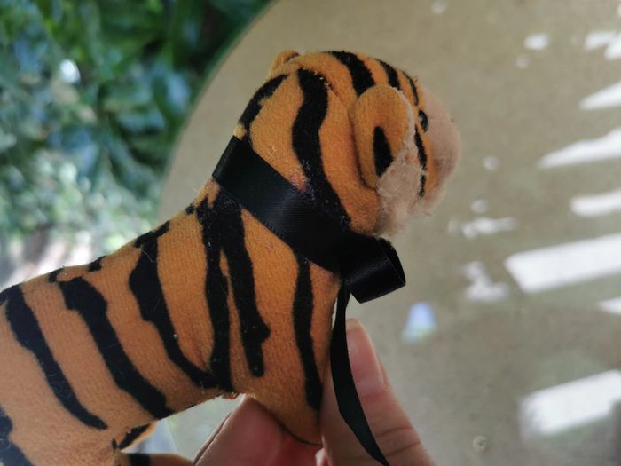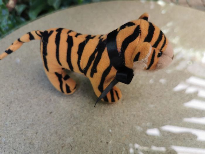 Peluche tigre miniature noeud papillon noir. La peluche est en bon état général, a été réstauré, certaines traces de vernis n'ont pas pu être enlevés. Taille 13 cm, poids 25g. #tigrepeluche #peluchetigre #petitepeluche