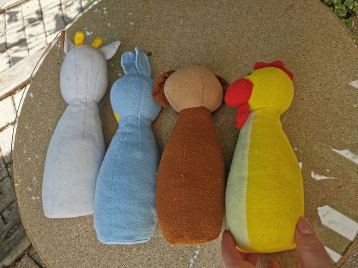 Quilles animaux en peluche, 4 peluches en bon état général, peluchées et ont du mal a tenir debout, la vache est tachée. Le prix bas tient compte des défauts. J'ai : le chien, la vache, le lapin et le coq. La teille des peluches fait 20 cm, poids 277g. #quilles #quillesanimaux #peluchesanimaux #peluchesquilles