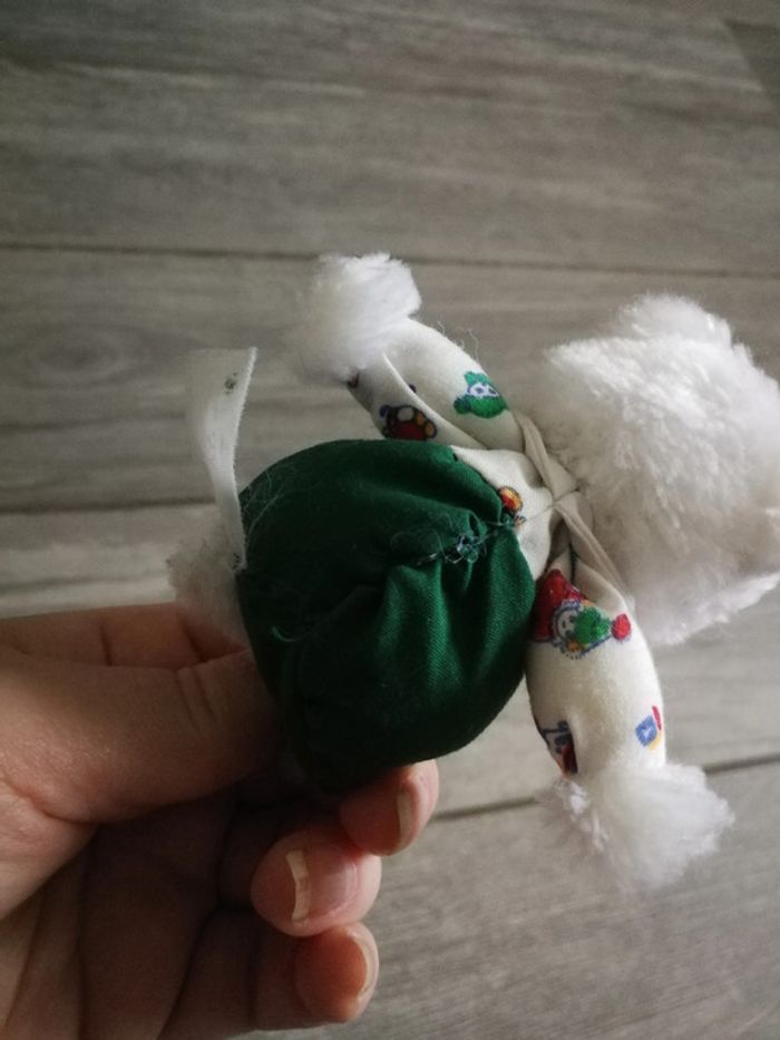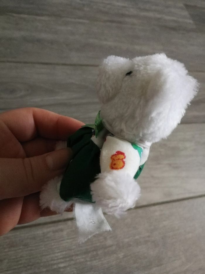 Ours blanc très petite peluche Yves Rocher, en tenue verte, ancien, bon état général, taille 9 cm, poids 8 g #oursblanc #oursyvesrocher #pelucheyvesrocher #pelucheours