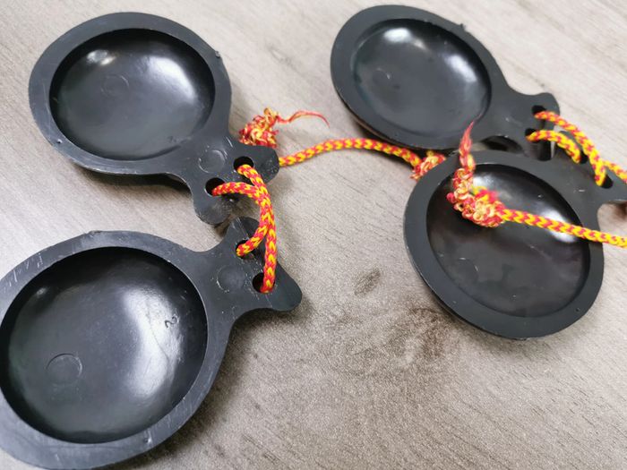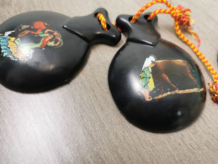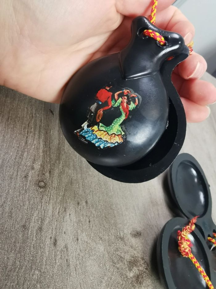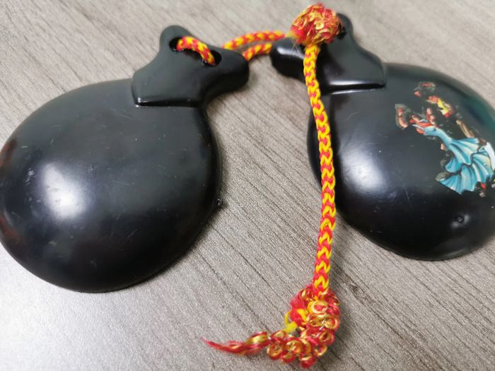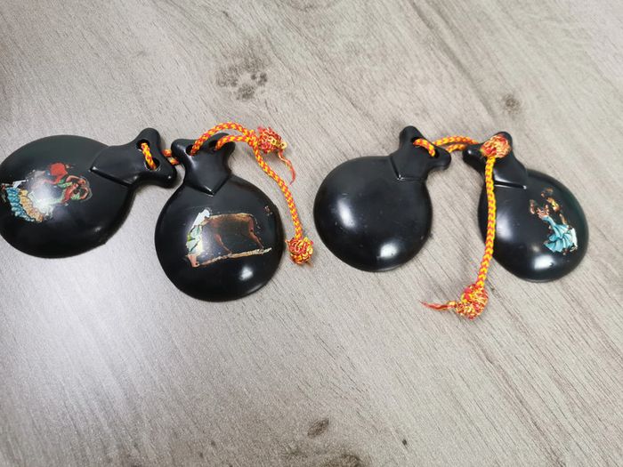 Castagnettes en plastique noir avec les autocollants, mais qui s'en vont. Les castagnettes mêmes sont en très bon état. Taille 8x6 cm, poids 59g. #castagnettes #castagnettesnoires #castagnettesplastique