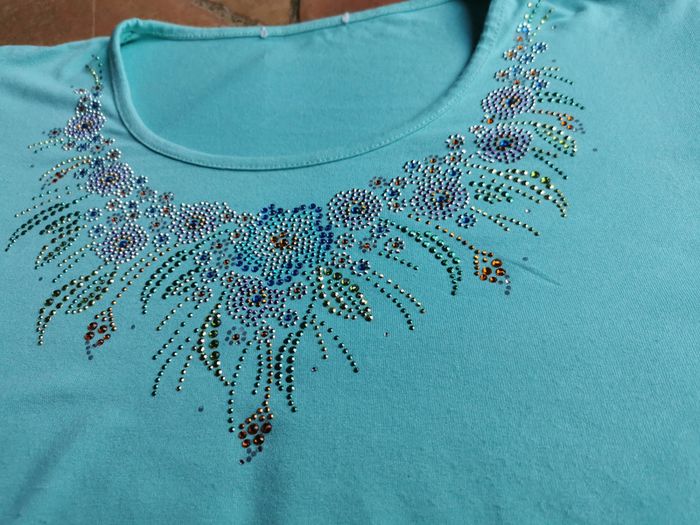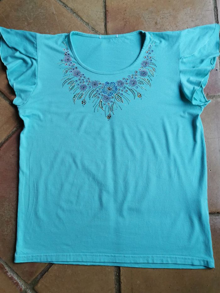 T-shirt bleu turquoise brodé de strass - photo numéro 1