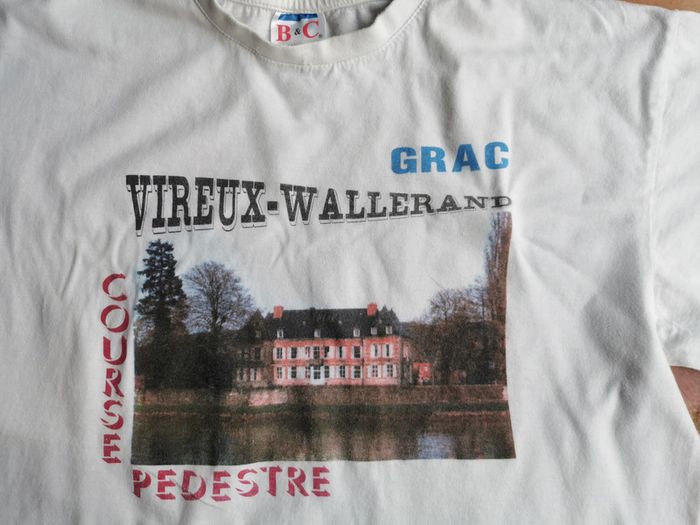 T-shirt en coton blanc imprimé B & C, course pedestre, en très bon état, devant à l'encolure la couture est un peu décousu, fil apparent, manches courtes, taille M. Mesures : Longueur : 63 cm Largeur entre les épaules : 52 cm Largeur entre les aisselles : 54 cm Longueur manche depuis l'aisselle : 16 cm Poids : 141g #tshirtblanc #teeshirtimprime #tshirtcoton