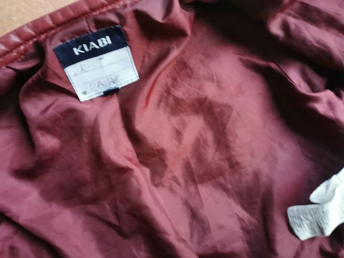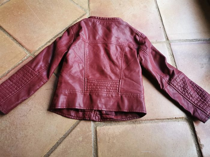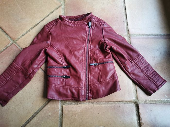 3. Veste rouge bordeaux en polyurethane, à zip, avec deux poches zipées et une imitation, 5 ans, 108-113 cm, marque Kiabi, bon état général, l'étiquette de nom est signée, le bas de la veste et une manche est marquée par le manquement de cette matière synthétique.