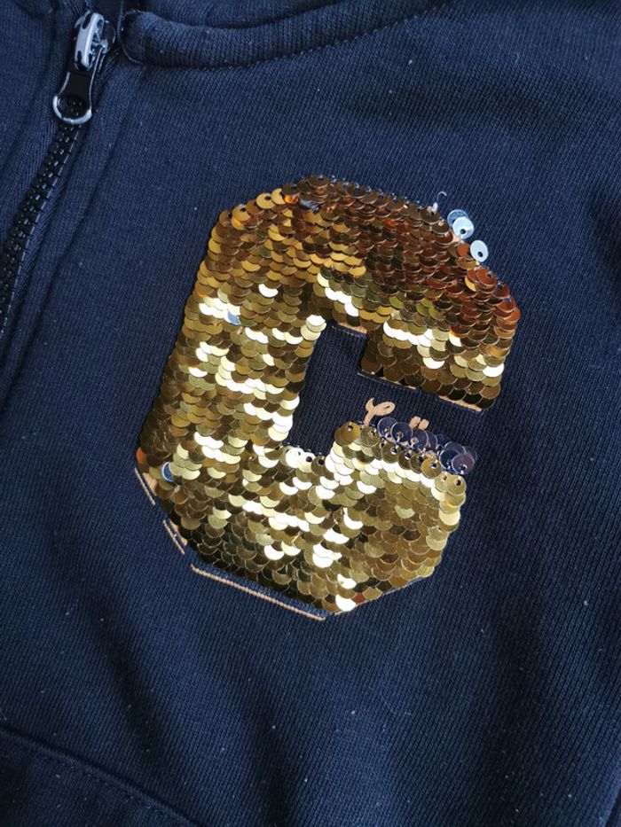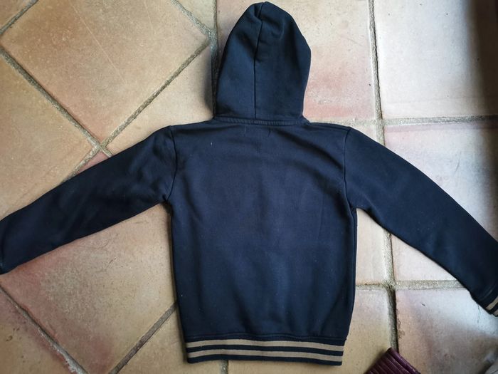 2. Gilet noir à capuche, sans lacet, avec la lettre C de Collège brodée en paillette, manches longues, 6 ans, marque Aéropilote, composition : 65% coton, 35% polyester, bon état.