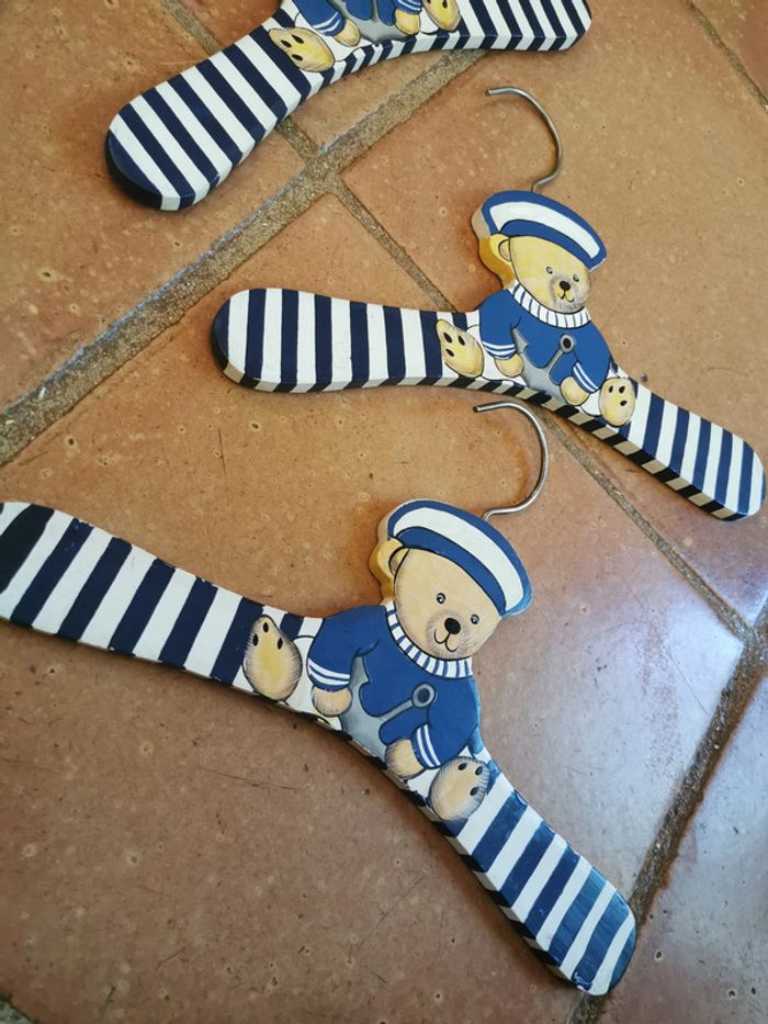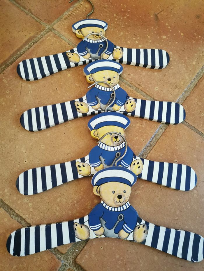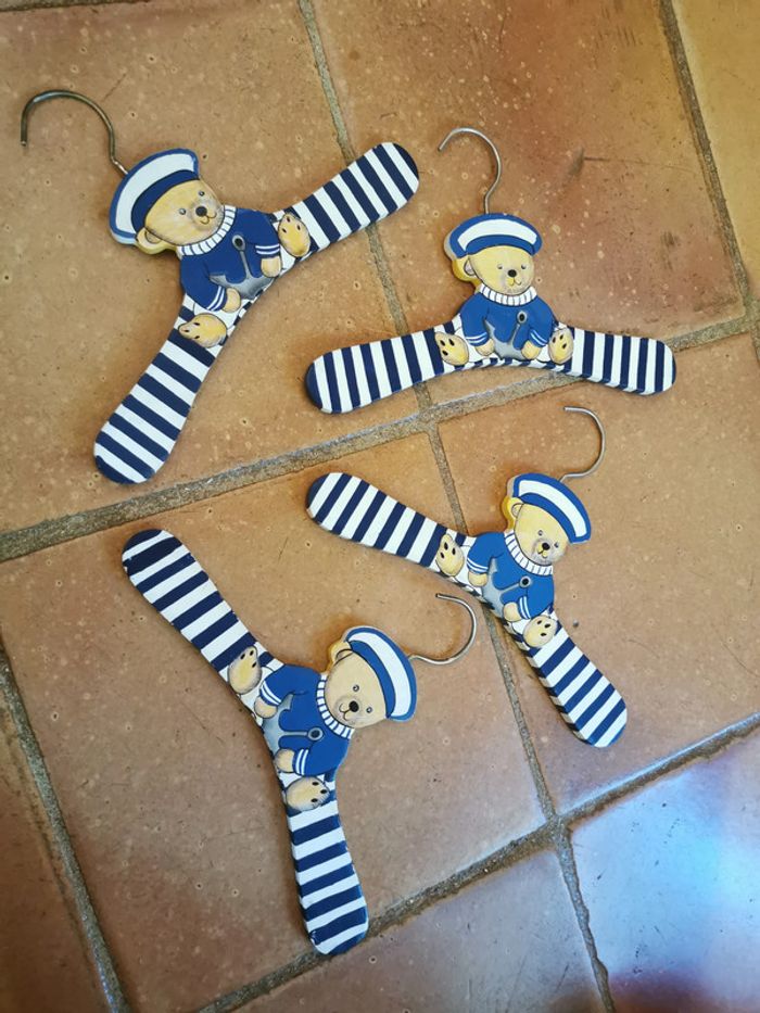 Cintres bois enfant ours marin, lot de 4, les crochets sont en métal, le lot est en très bon état général. Belle décoration ou le rangement pour les vêtements d'enfants. Dimensions : Longueur : 30 cm Largeur : 1 cm Hauteur avec le crochet : 17 cm Poids : 353g #cintres #cintresenfant #cintresenbois #rangementenfant #vetementsenfants