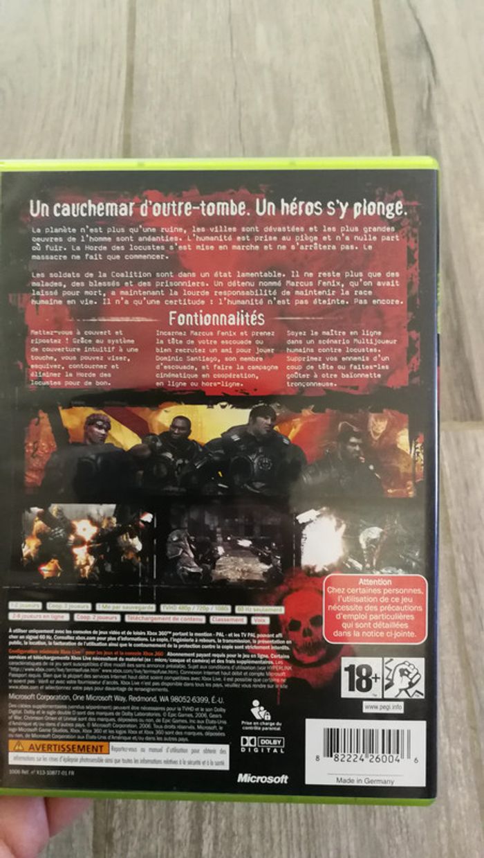 vends jeu pour XBOX360 « Gears of War » 18+. le CD présente de légères marques mais rien d’important et il fonctionne parfaitement. le boîtier est en parfait état. le livret est légèrement pincé. il pèse 122g #gearsofwar #jeuxbox #jeu18ans #jeuvideo