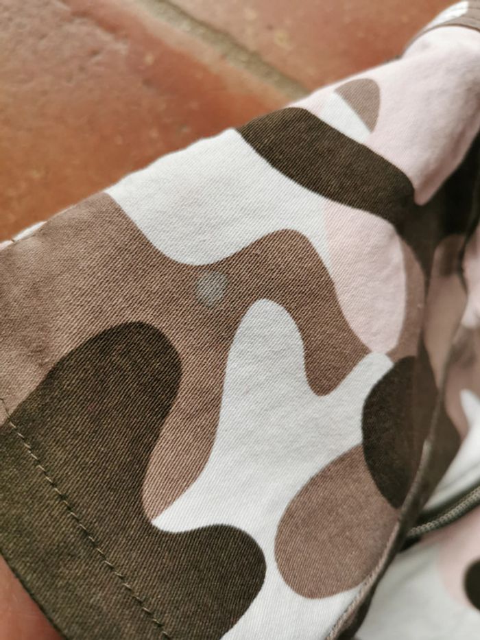 Crop top à bretelles imprimé militaire dans les couleurs rose, kaki et blanc, marque Jennyfer, taille M, devant avec la fermeture éclair, les côtés élastiques, les bretelles larges type salopette. Très joli débardeur, en très bon état général avec une petite tache (voir la photo), composition 98% coton 2% elasthanne. Mesures : Longueur : 18 cm Largeur : 33 cm Largeur entre les aisselles : 37 cm Poids : 150g #croptop #croptopmilitary #croptopbretelles #debardeurcourt #debardeurmilitaire #debardeurbretelles