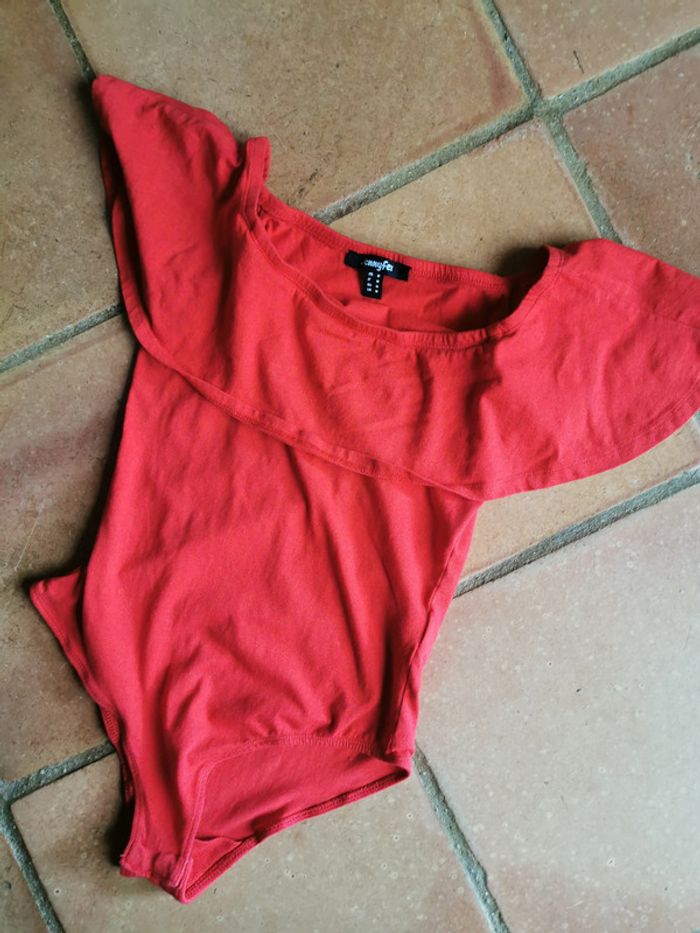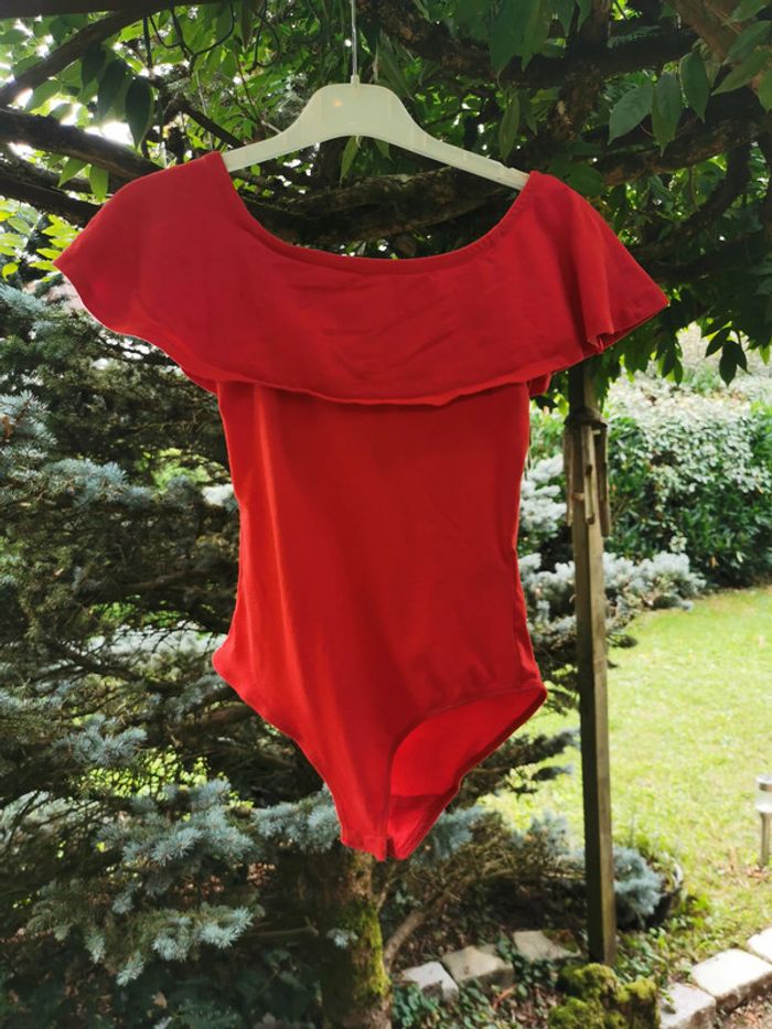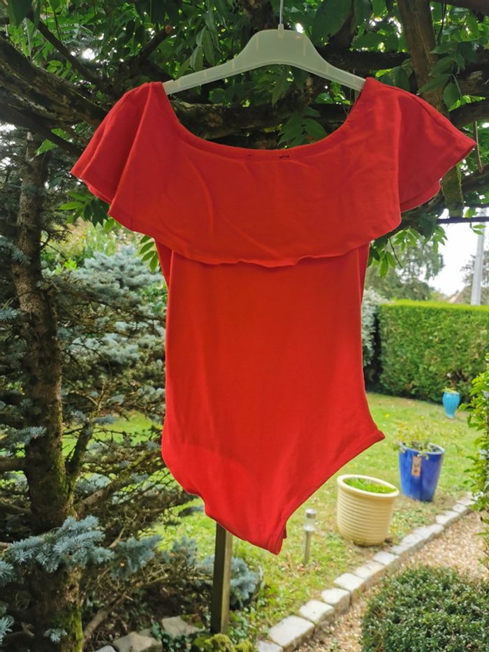 Body rouge à volants, marque Jennyfer, taille M, en très bon état, comme neuf, composition 96% coton, 4% élasthanne. Mesures : Longueur : 56 cm Largeur taille : 31 cm (40 cm si étiré) Largeur entre les aisselles : 38 cm Largeur épaules : 31 cm Poids : 104g #bodyrouge #bodyjennyfer #bodycoton #bodyavolants