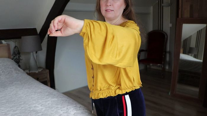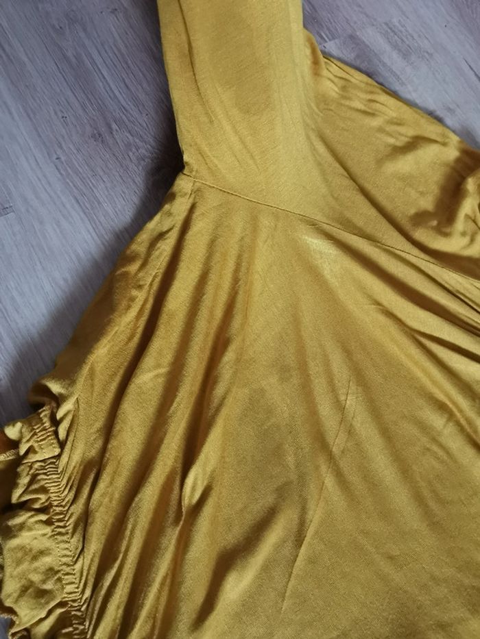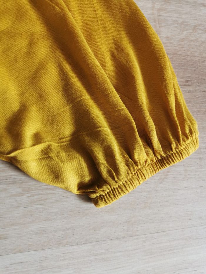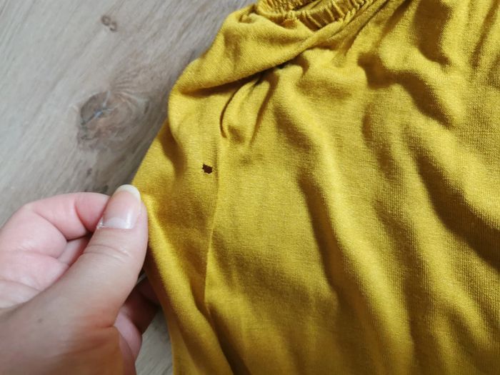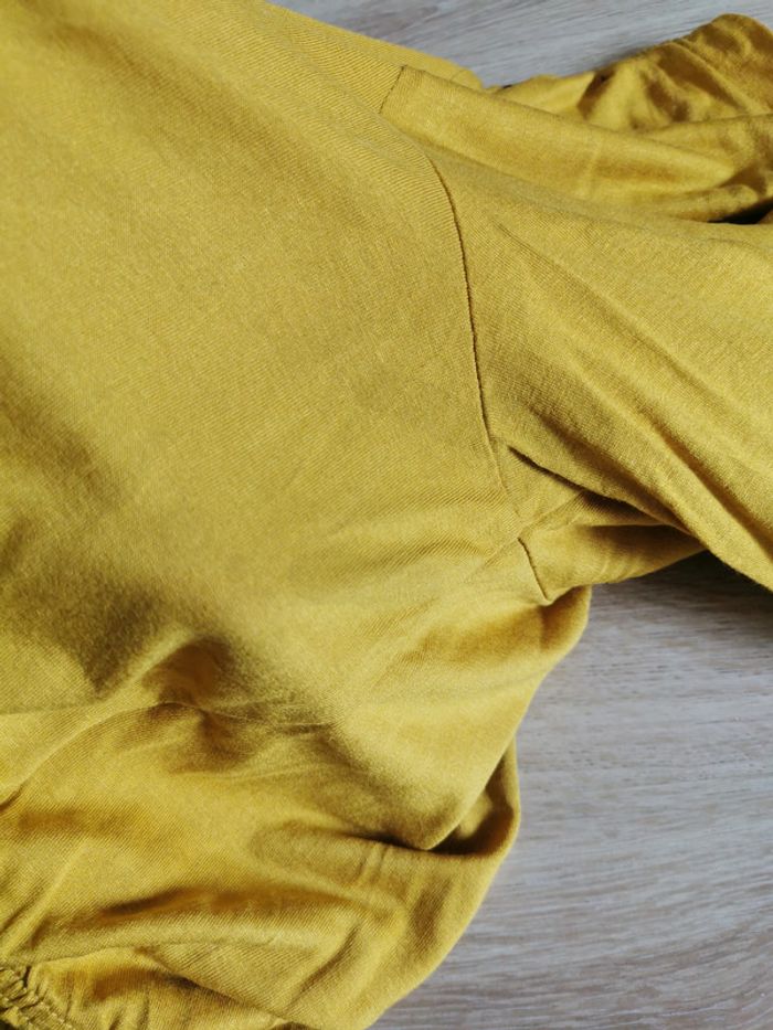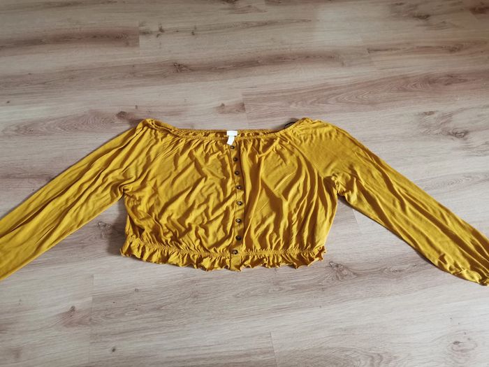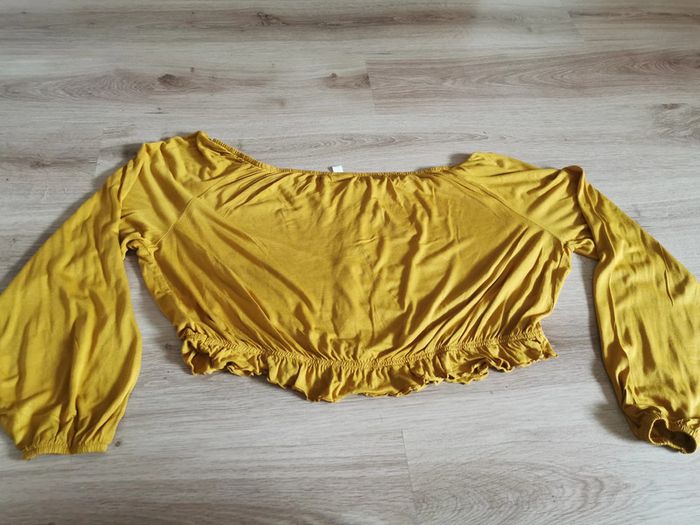Top épaules dénudées court couleur moutarde H&M. Top épaules dénudées en jersey de viscose. Modèle avec boutonnage décoratif devant. Élastique en haut, au niveau de la base volantée et en bas des longues manches raglan, viscose 100%, taille XL. Le haut est en bon état général taché (voir les photos) et un petit trou sur une manche.