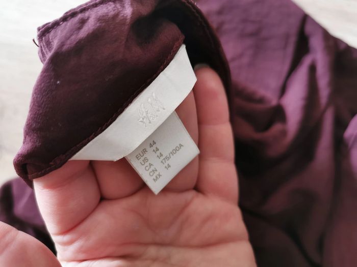 Blouse H&M manches longues droite couleur aubergine. Jolie blouse en polyester type satin, taille 44, en très bon état général, a deux petites accroches devant (voir la photo), au dos deux petits boutons, le bas arrondi. Mesures : Longueur : 80 cm Longueur côté : 32 cm Largeur les épaules : 44,5 cm Largeur entre les aisselles : 57 cm Longueur manche depuis l'épaule : 61 cm Longueur manche depuis l'aisselle : 48 cm Largeur manche : 16 cm Poids : 160g #blouselongue #blousmancheslongues #blousehm #blousexxl